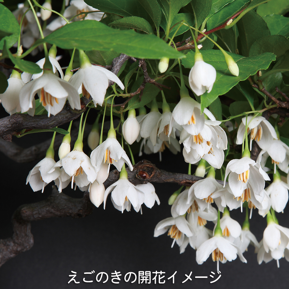 エゴノキ科エゴノキ属の落葉小高木。初夏、新梢の枝先に白またはピンクの花を総状に下垂して開き、夏に青白色に熟すドングリに似た果実は見るからに涼しげで愛らしい風情です。春の芽出し、花・実の風情、寒樹の繊細さと一年を通じて楽しめる樹種です。えごのきは樹性が強健で切り込みに耐え、旺盛な萌芽力を示して小枝が密に仕上がります。