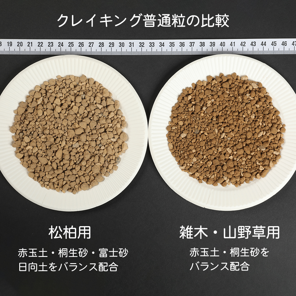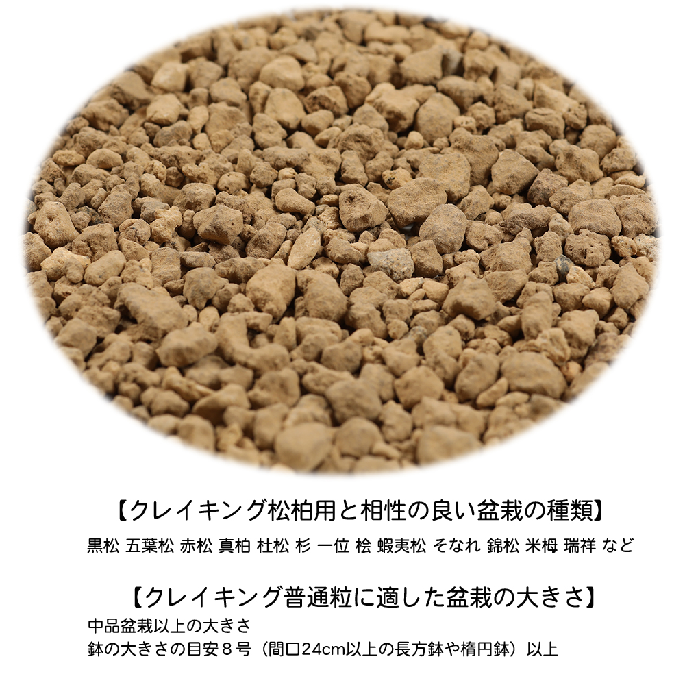 また、水捌けに大変優れており、クレイキングを使って植え替えすることで、排水性改善、根腐れ防止などの効果を期待できます。クレイキングは配合不要。便利で手間いらず。そして盆栽の育ちが良くなることに貢献する最高級盆栽用土です。