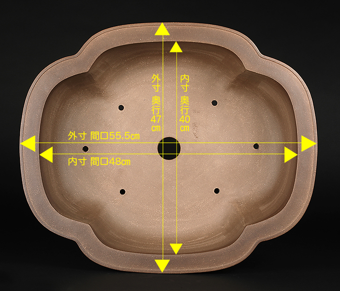 柔らかな型の木瓜型に胴紐をあしらい格調高いデザインに仕上げた一枚。烏泥の美しい土目との相性も抜群です。大物盆栽に最適な尺八寸(55cm)で用途の広さが魅力。側面に色ムラがあるため1.5級品扱いです。キズなどではありませんので安心してお使いいただけます。