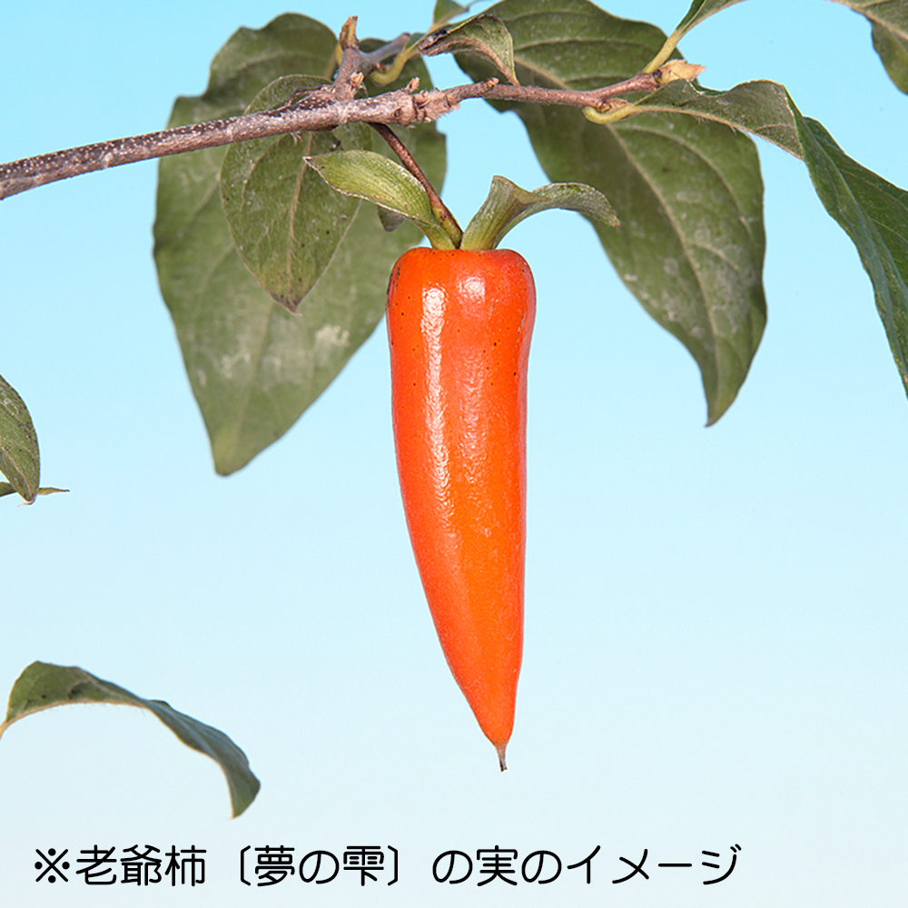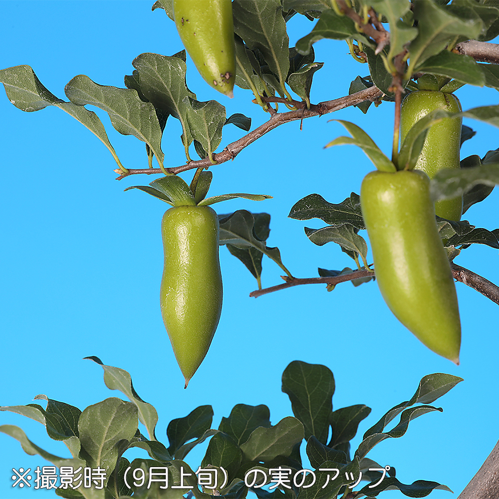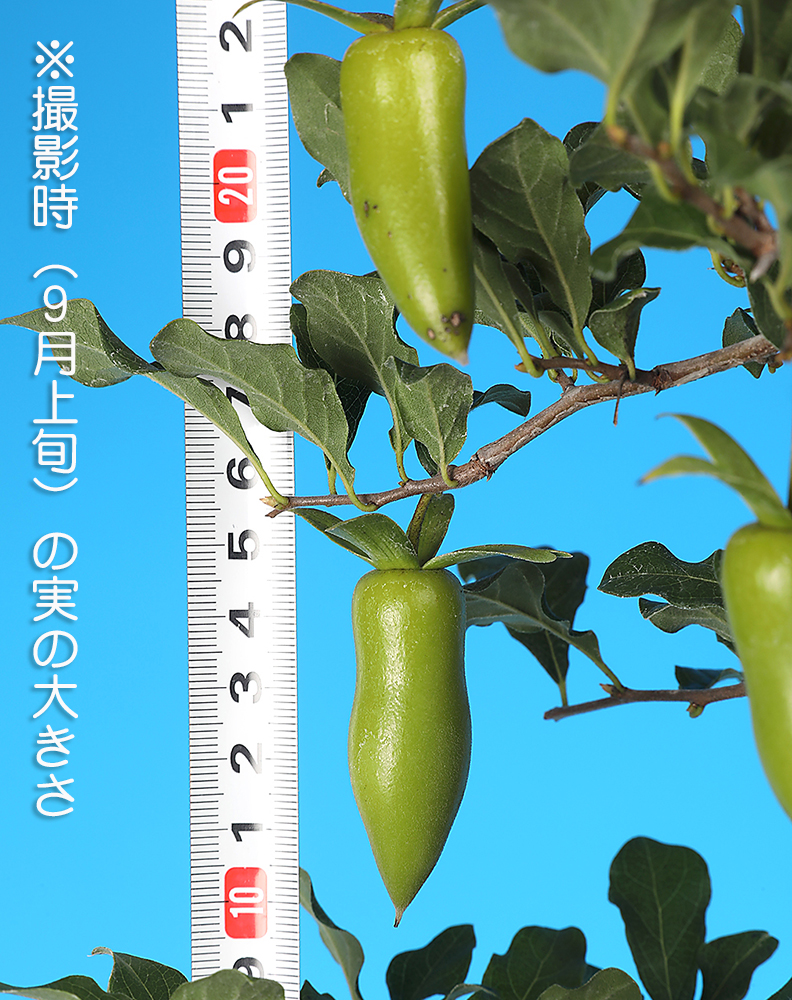 なんと長さ6㎝、ひょうたん型の柿色の大実が見事な、近年注目の人気品種です。プラ鉢入。