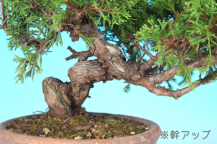 幹模様やシャリと水吸いの変化など、優秀な幹骨を備えた真柏の逸品素材。本格的な真柏の小品盆栽に仕立てるのに最適なサイズです。
