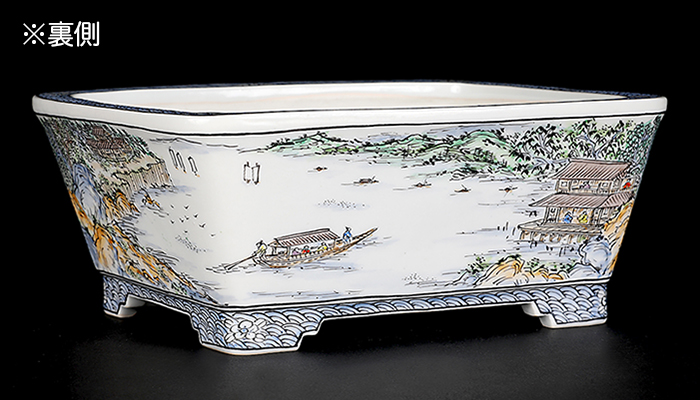 柔らかで深さのある長方鉢。サイズも良く、小品盆栽に幅広く使えます。しっかり書き込んだ部分と余白部分とのメリハリが利いた絵付けで、友の元を訪れる高士、そして水辺の景色が上手く調和した抜群の仕上がり井です。落款:月之輪正泉