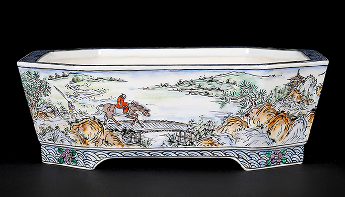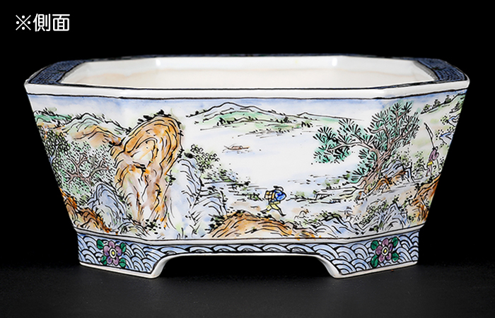 隅切のカッチリとした型で存在感抜群の長方鉢。友の元を訪ねる高士を描いた訪友図ですが四面をフルに活かした廻し絵は圧巻の一言。涌泉を彷彿させる色使い、奥行感のある雄大な景色と素晴らしい仕上がりです。落款:月之輪正泉