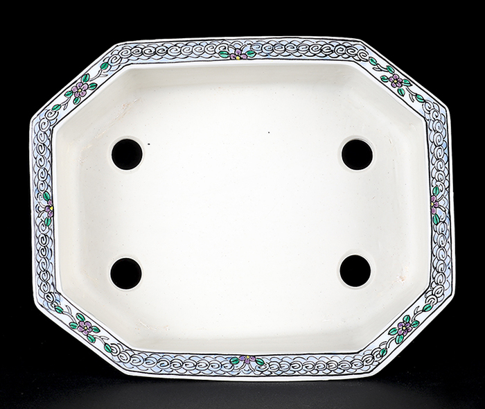 近年は小品盆栽に使える長方鉢、木瓜式鉢などを中心に作陶。また得意のロクロ成型からの削り出しによる六角型の輪花縁といったオリジナルデザインも生み出しています。絵付けは涌泉が用いた山水や雲龍図などをベースにしていますが、五彩などは技術の向上により正泉独自の色彩を表現、国内のみならず海外でも高い人気を誇ります。