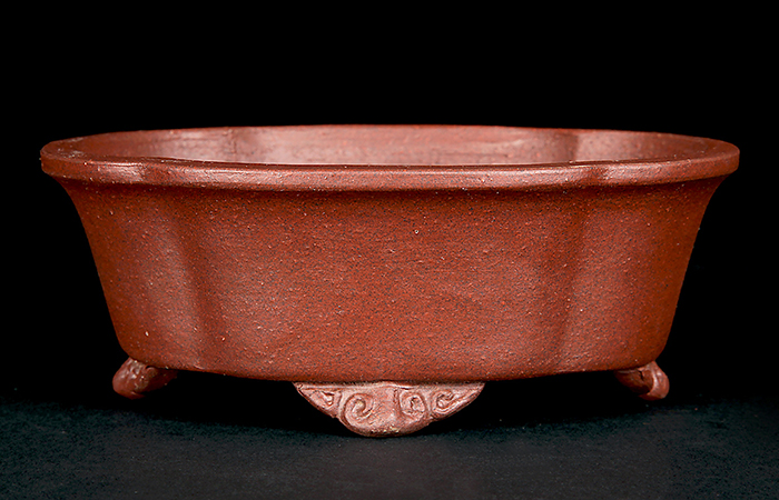 すっきり洗練された型の木瓜型で雲足の意匠が良く映える作品。本格的な小品盆栽に最適な寸法で深さもあるので迫力ある樹も受け止めます。
