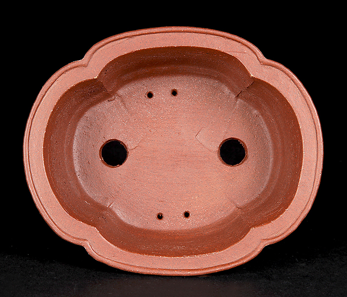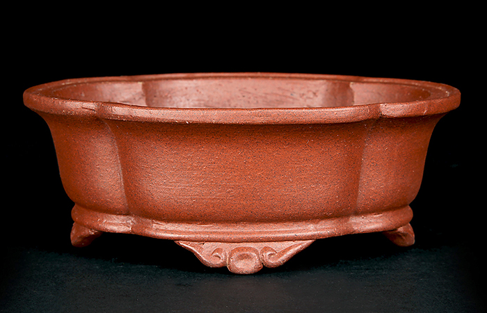 高台付きの格調高いデザインの木瓜式鉢。本格的な小品盆栽に最適な寸法で深さもあるので迫力ある樹も受け止めます。