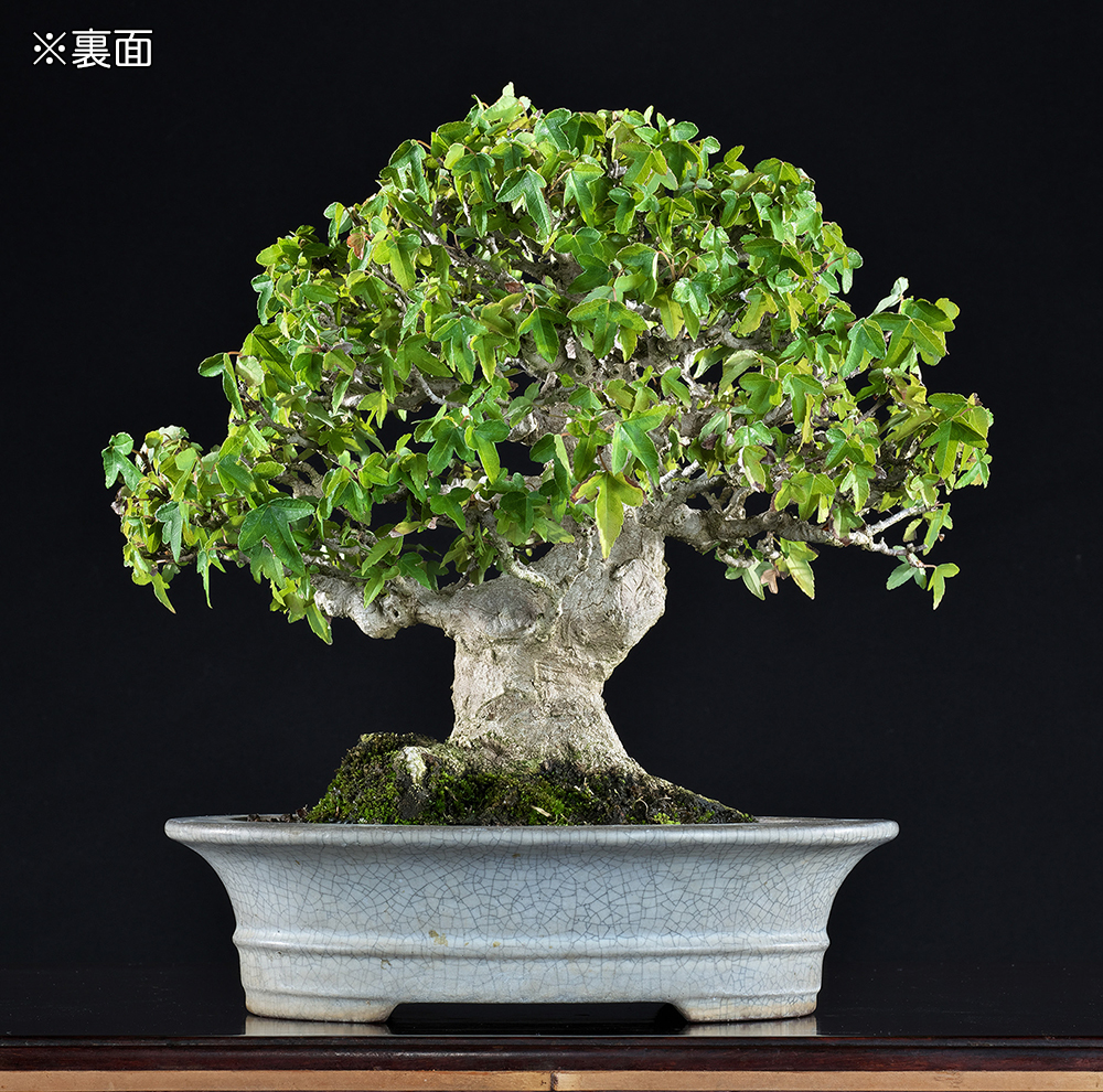 緩やかな模様を描く幹の外側にバランス良く下枝が配置され、小枝も丁寧に作られている。幹肌の時代感も素晴らしく、鉢を変えるだけで小品三点飾りの主木として飾ることができる仕上がりである。