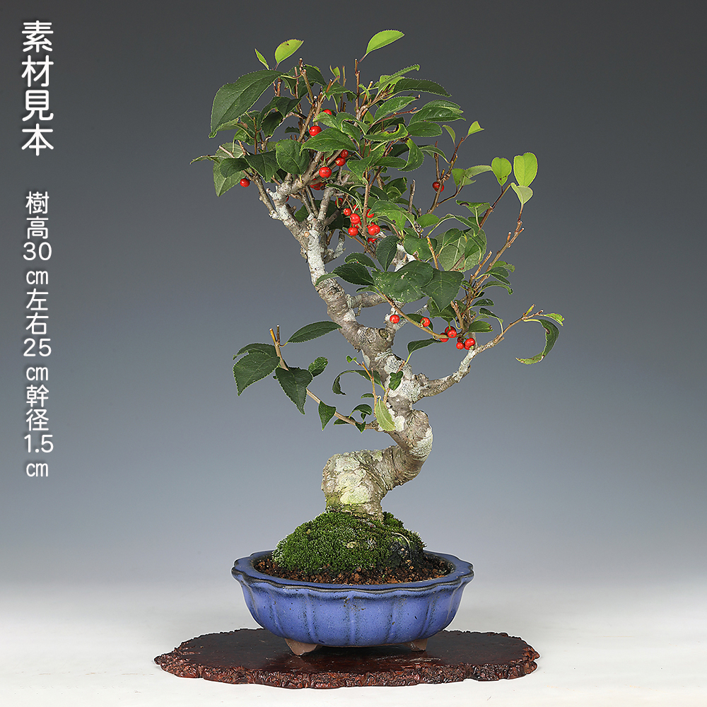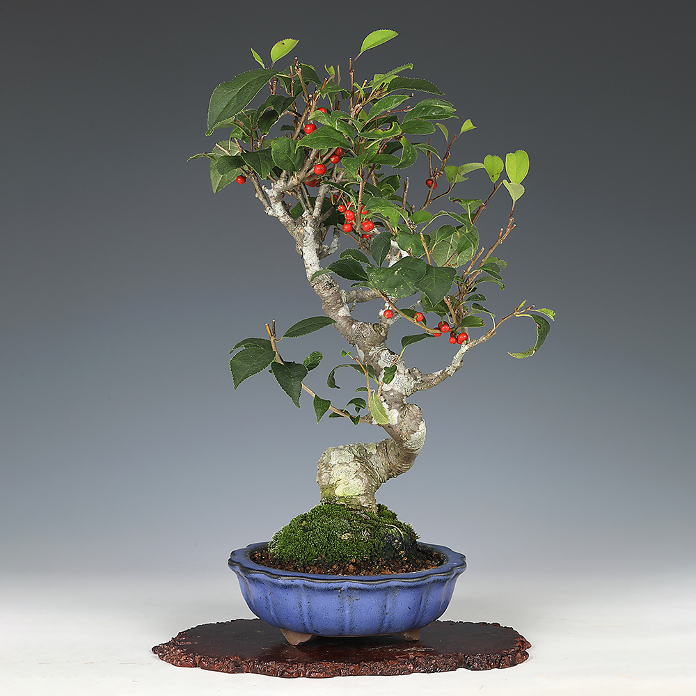 晩秋から冬にかけて、深紅に輝く小粒の果実で周囲を明るくしてくれる梅もどき。枝づくりがしやすく、幹肌や枝ぶりにも味がり、つくっても飾っても楽しい樹種です。数ある実物盆栽でも一・二を争う人気樹種です。