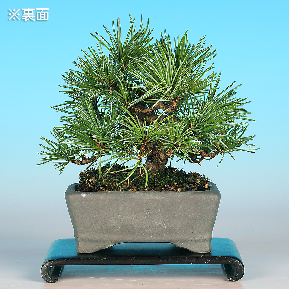 那須五葉松の貴重な実生素材。これら葉性に特徴のある品種は、100%親木の性質を受け継ぐことができる挿し木で殖やすのが一般的。ところがここに紹介した樹は、実生18年。根上がりの芸や細かな幹模様は、実生樹ならではの魅力。掌に収まる樹高10㎝前後の寸法も極めて珍しく、ミニ盆栽愛好家必見の逸品。