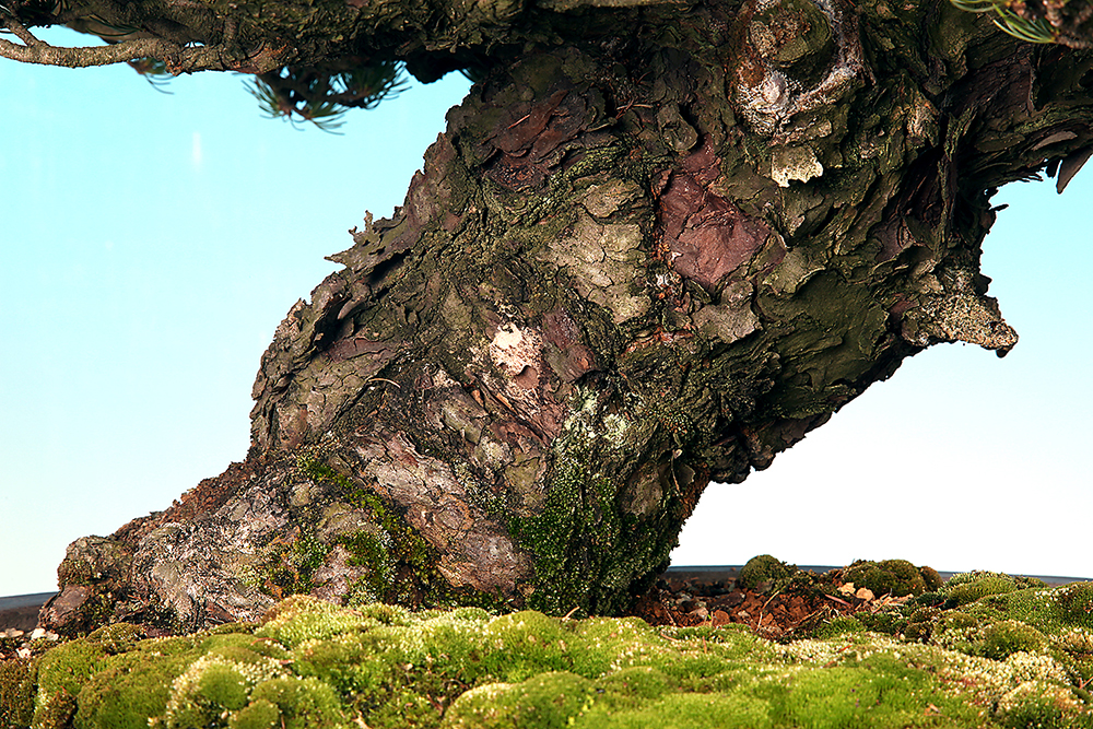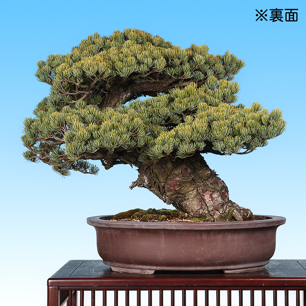 おそらく黒松を台木に接がれたものと思われるが、時代を経るごとに接ぎの違和感は薄れており、太幹の古色や時代感が秀逸。葉性の良さも素晴らしく、左右下枝の充実を図って大きな景色の樹形に仕立てたい。