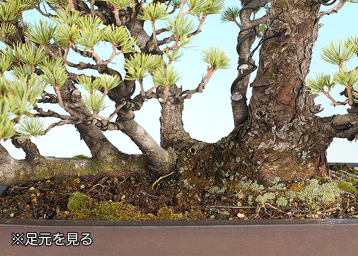 立ち上がりで双幹状に岐れた子幹を水平に倒して、根連なり樹形の基礎が作られたものと思われる。主幹と子幹のバランスは整ってるので、鉢を工夫すればさらなる大化けも期待できるだろう。