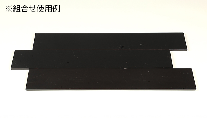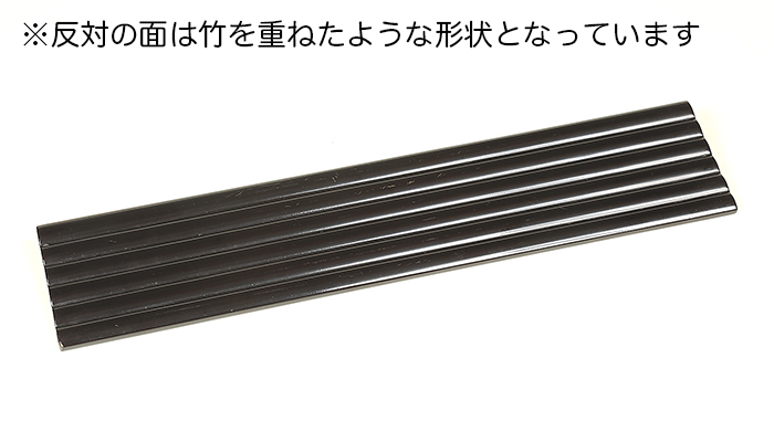短冊状の板三枚がセットになった、高級感溢れる漆塗地板。片面は整った板目であるのに対し、反対面は竹節を並べたような形状をしており、飾る樹の種類や季節などによって使い分けることができる。一味違った飾りを演出するのに最適な逸品。共箱付。