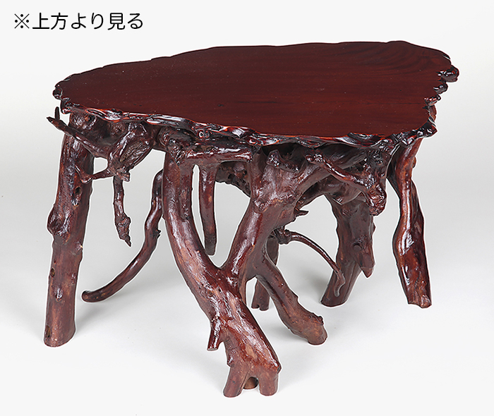 繊細な根芸ながらもしっかりと安定した作りで、太幹の懸崖樹など流れの強い樹形との相性は抜群。一般的な卓とは違った野趣味溢れる飾りを演出できる逸品卓。