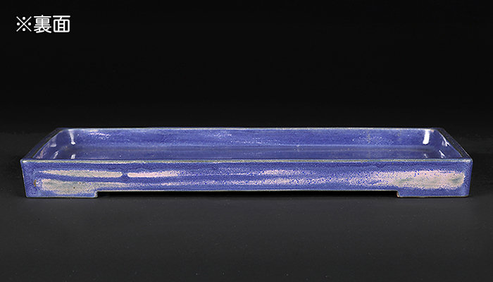 瑠璃釉の発色が窯変で桃色に変化し、面白い景色を作り出している。切立切足の精緻な型は、さすが香山という出来栄え。尺サイズの寸法で水石飾りの他に石付盆栽にも重宝する逸品。木箱付。落款:平安香山作