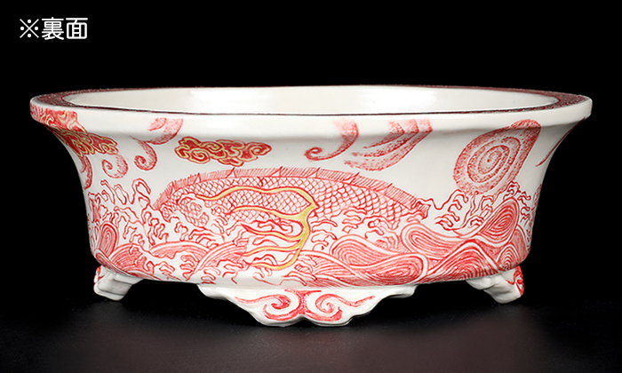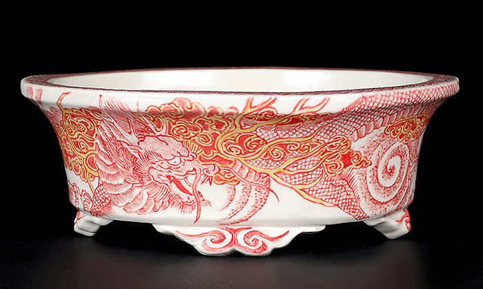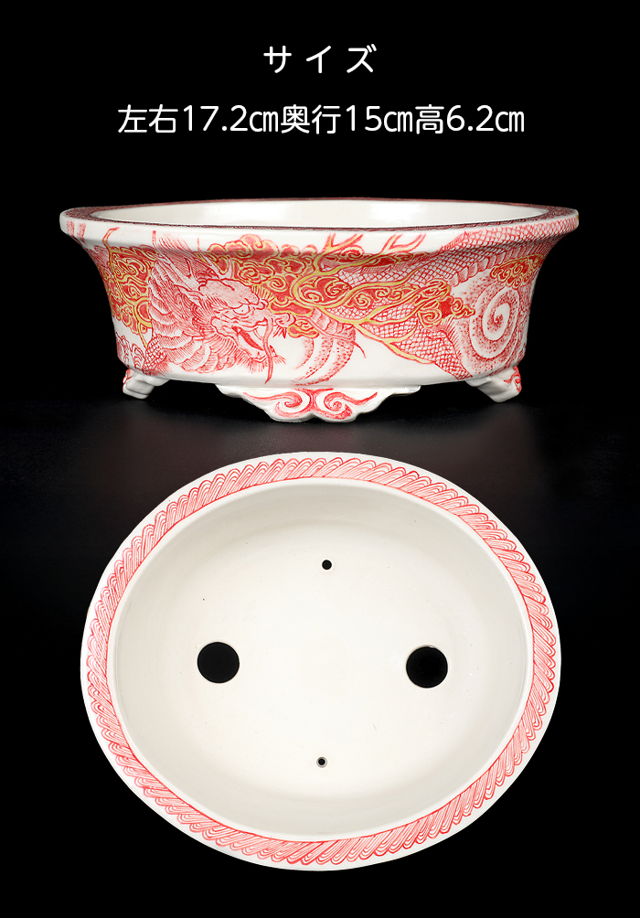 九谷峰山のボディに高山が絵付をした合作鉢。赤絵の意匠に、鮮やかな金の色彩が施された細工が美しい。豪快に描かれた龍の図案も素晴らしい。本格的な小品盆栽に使えるサイズも魅力です。落款:高山・九谷峰山