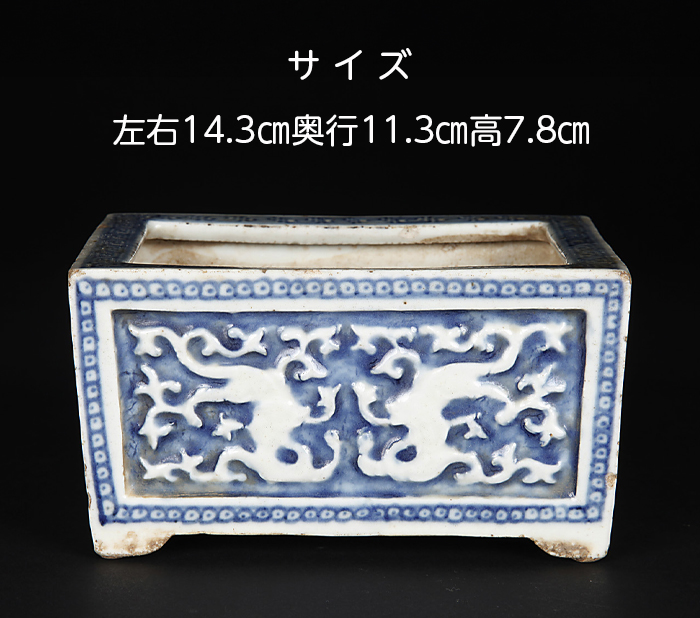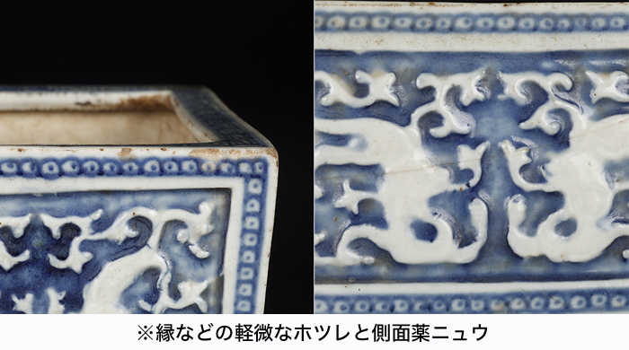 額面の中に浮彫細工が施された、非常に珍しい広東鉢。均釉と白釉のコトンラストも大変美しく、広東鉢としては群を抜く仕上がりを見せています。約二百年前に焼成されたものと思われ、長年の継承による時代感が最高の風合いを醸し出している。小品サイズではあるが抜群の存在感を放つ珍品にして名品。縁や側面などに軽微なホツレや、側面にごく薄い薬ニュウなどがあるが、使用には全く問題ありません。