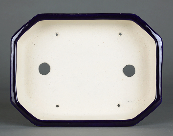 この作品は瑠璃釉をベースにピンクの結晶が掛かった鴻陽得意の色鉢です。結晶の出方は1点1点違い、量産品ながら1点ものの価値があります。カッチリとした隅切型ですが、角に丸みを持たせて柔らかさを出すことで使いやすくなっています。貴風サイズにも使える大きめサイズです。