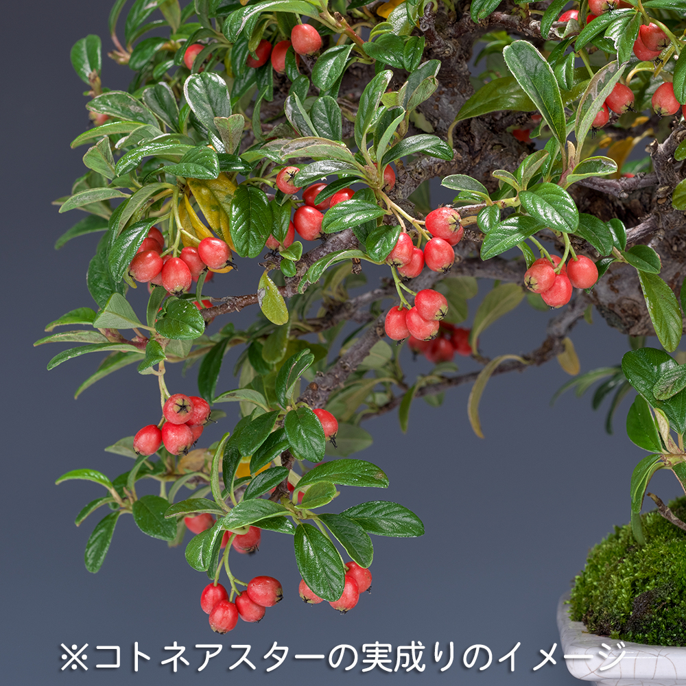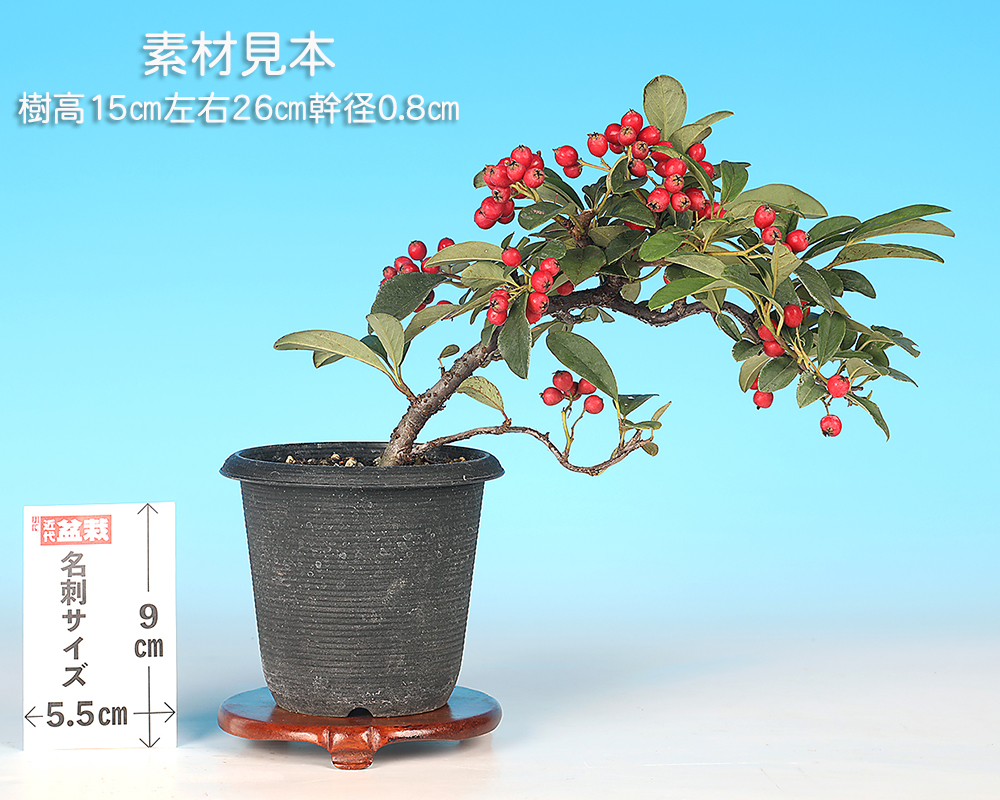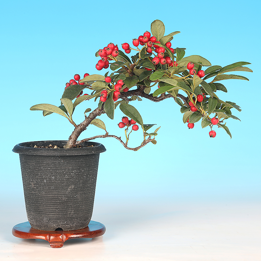 5月から6月頃に小さな紅色もしくは白花を咲かせ、実は小粒の球形。秋に熟して真紅に染まります。同属で盆栽素材として人気の高いベニシタンよりも果実は大きく、派手やかな印象です。樹性は極めて強健で萌芽力も強く、花が咲けば、ほぼ確実に実を結ぶので花物・実物盆栽の入門樹種として最適です。