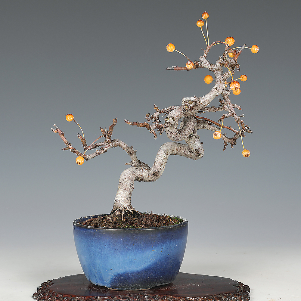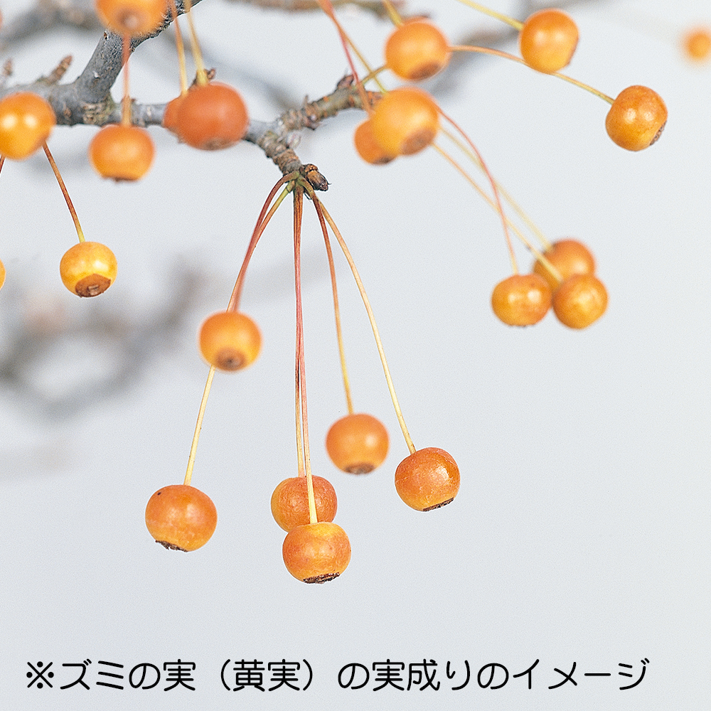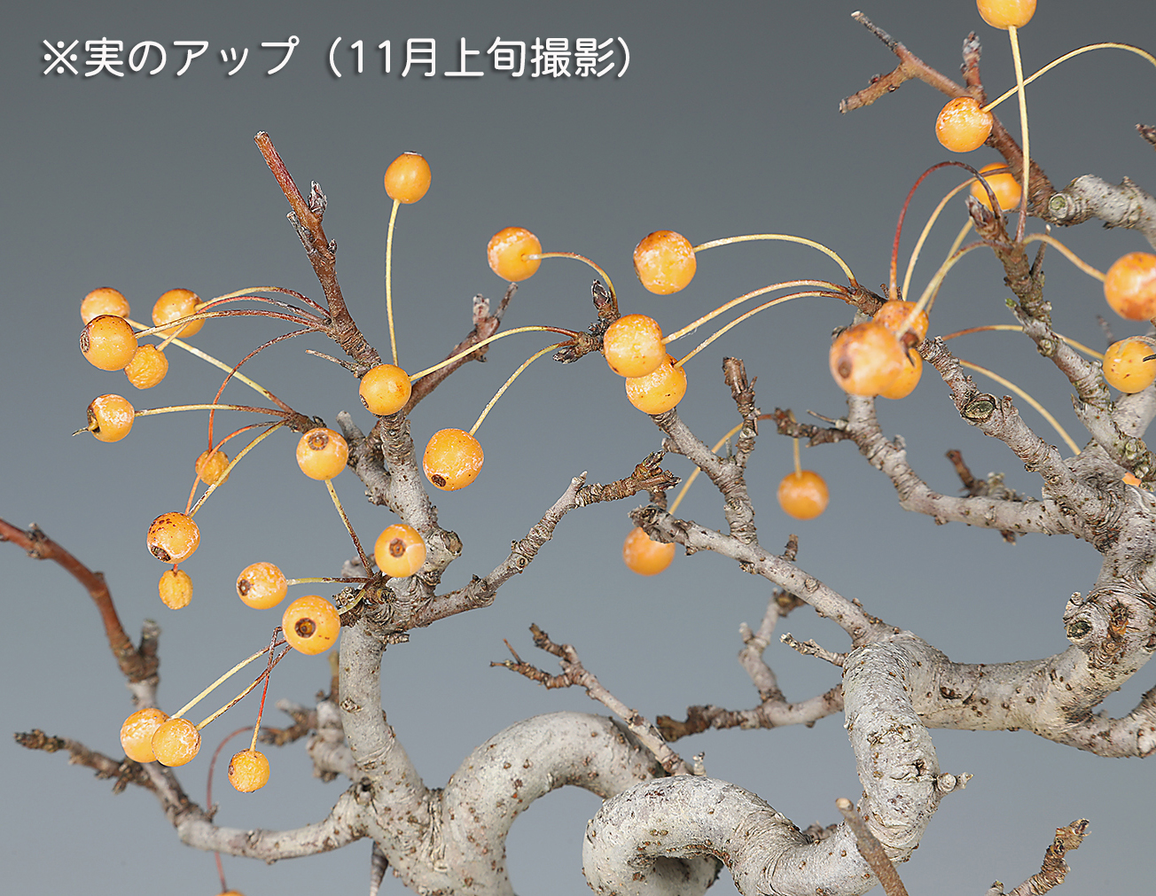 盆栽界で言う深山海棠は、赤実の実海棠や自生ズミ、ときわけズミの中でも希な黄実を重視する。それ以外にも花が華麗な垂糸海棠や花が上向きに咲く受咲海棠などがあり、それぞれに鑑賞価値は高い。実姿はもちろん、花姿、寒樹の姿と四季と通して楽しめる樹種です。
