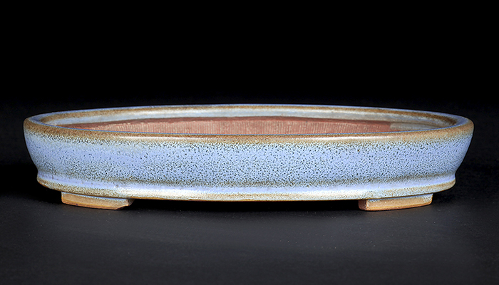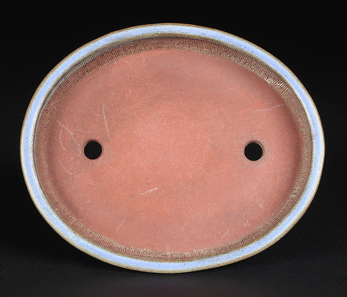 均釉は香山がこだわった釉薬の一つ。吹墨の手法で釉掛けされたものか、呂均釉のような釉紋が浮かび上がった美しい作品です。シャープなデザインはカミソリ香山の異名通りの仕上がり。浅手で奥行が広く取られた形状は根張りのある雑木盆栽に最適です。目立った傷はなく保存状態は良好。落款:平安香山