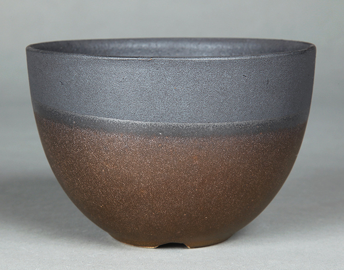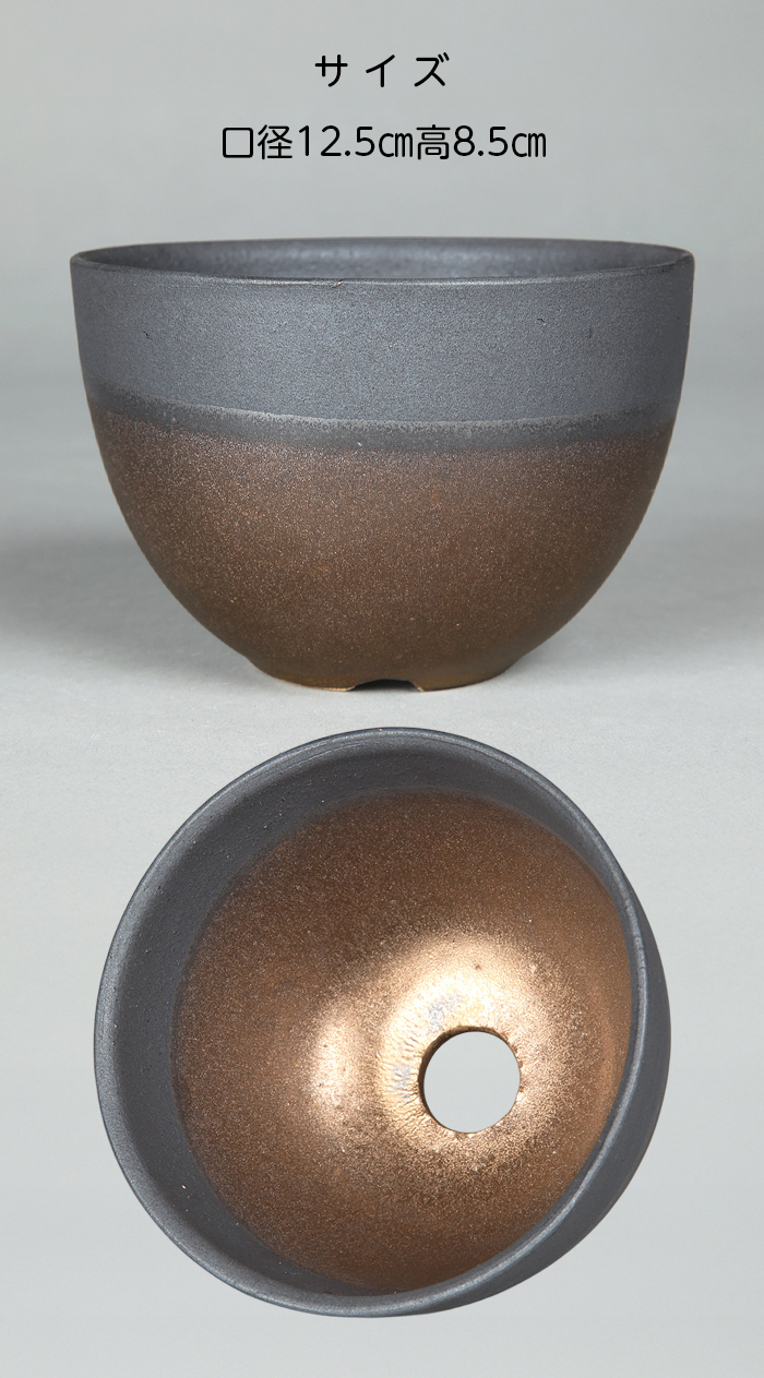 金色のテカリを抑えた釉薬をベースに上部は同じく黒のテカリを抑え釉薬を施したツートンカラーの洒落た丸鉢。小品盆栽、ミニ盆栽、山野草の単植え、寄せ植えと幅広く使えます。