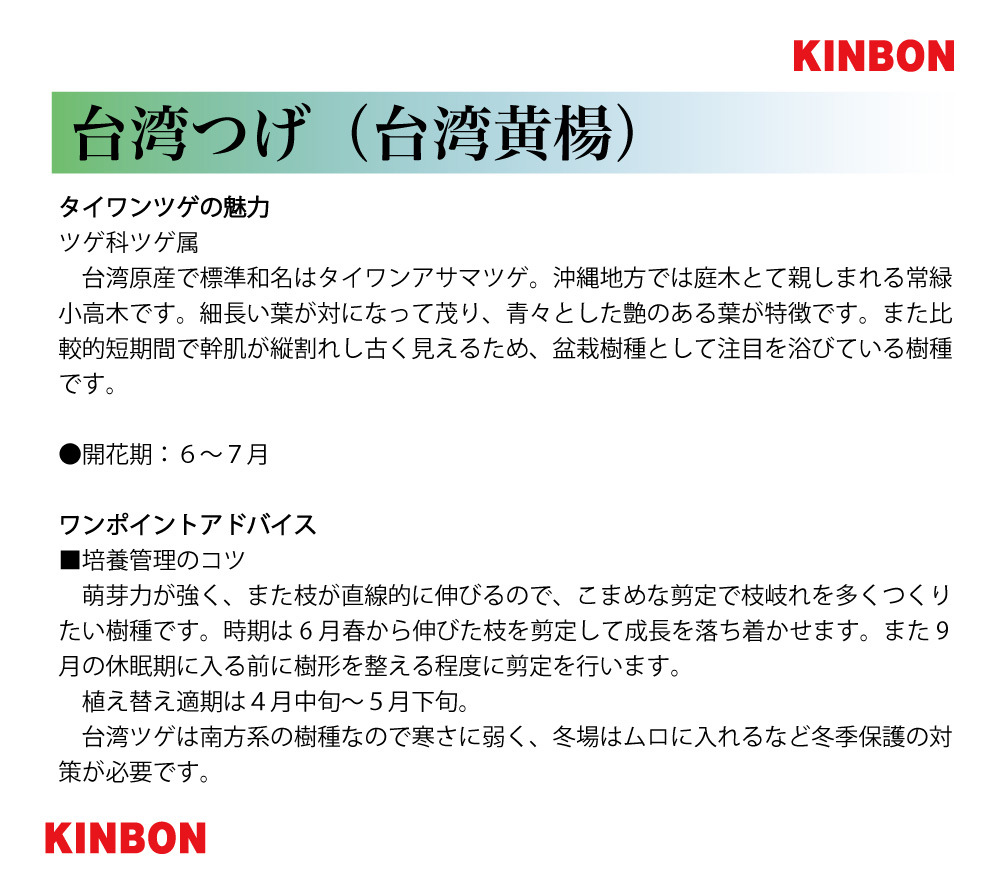 台湾ツゲは南方系の樹種なので寒さに弱く、冬場はムロに入れるなど冬季保護の対策が必要です。