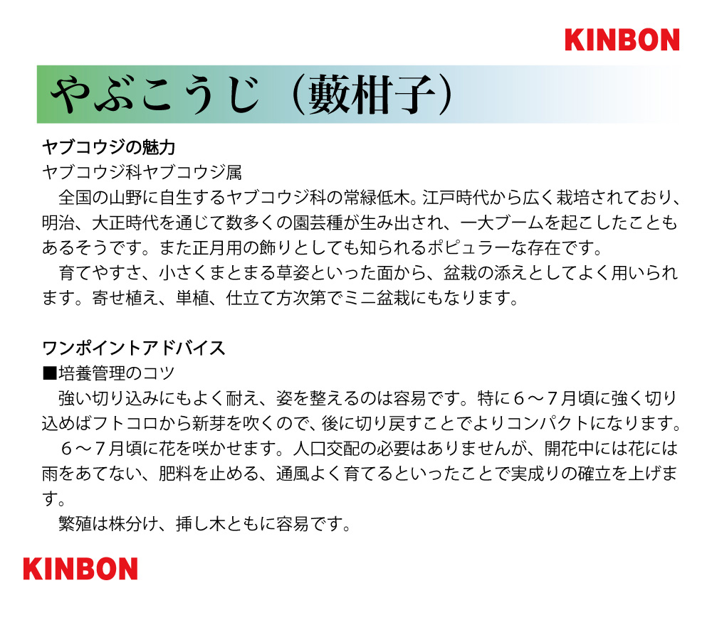 全国の山野に自生するヤブコウジ科の常緑低木。江戸時代から広く栽培されており、明治、大正時代を通じて数多くの園芸種が生み出され、一大ブームを起こしたこともあるそうです。また正月用の飾りとしても知られるポピュラーな存在です。