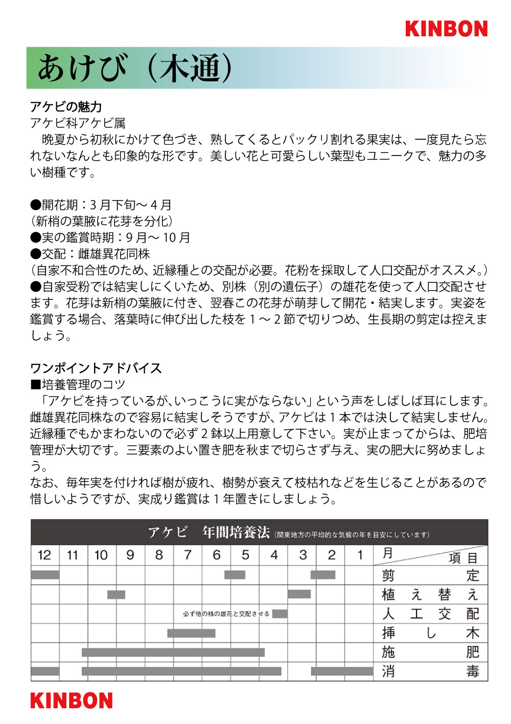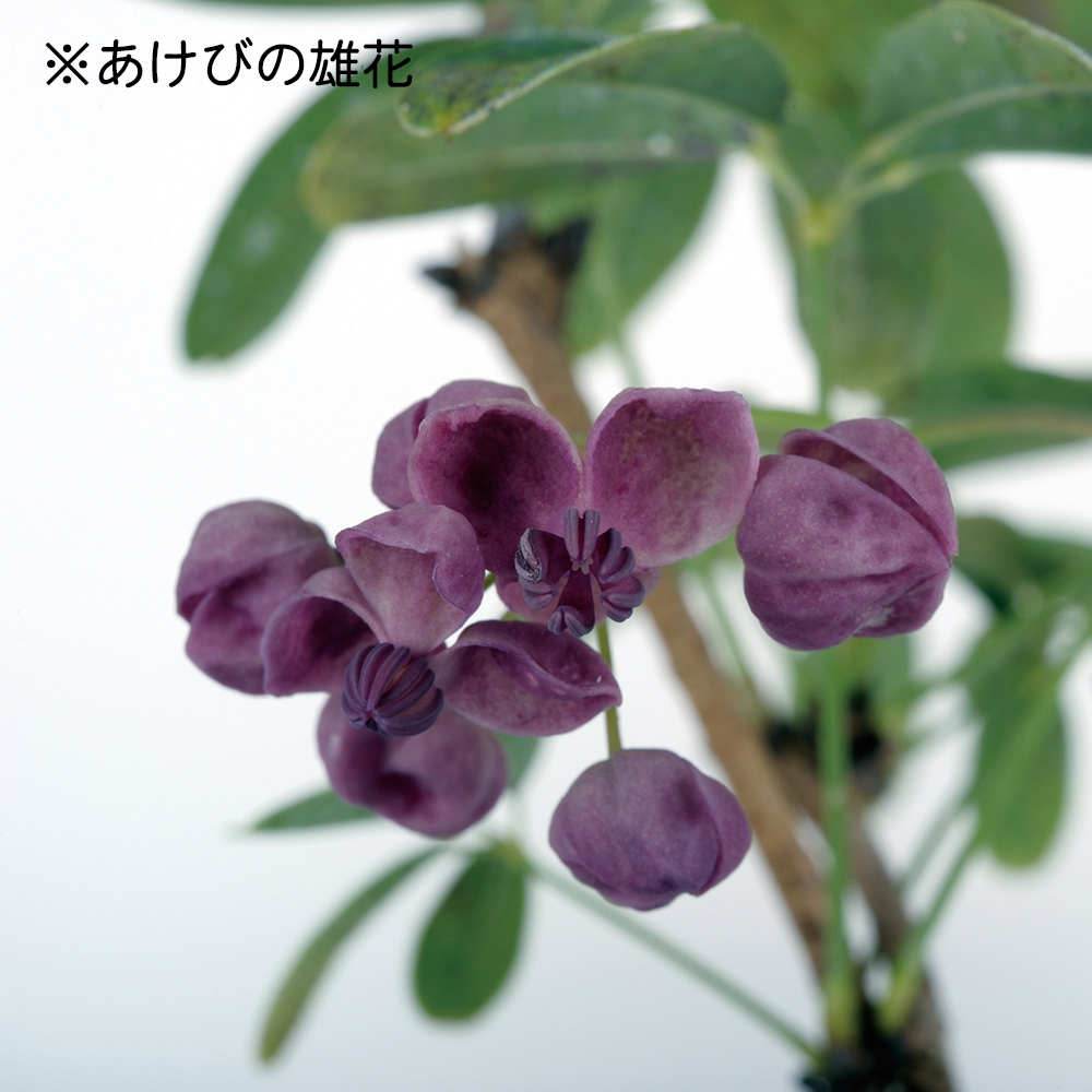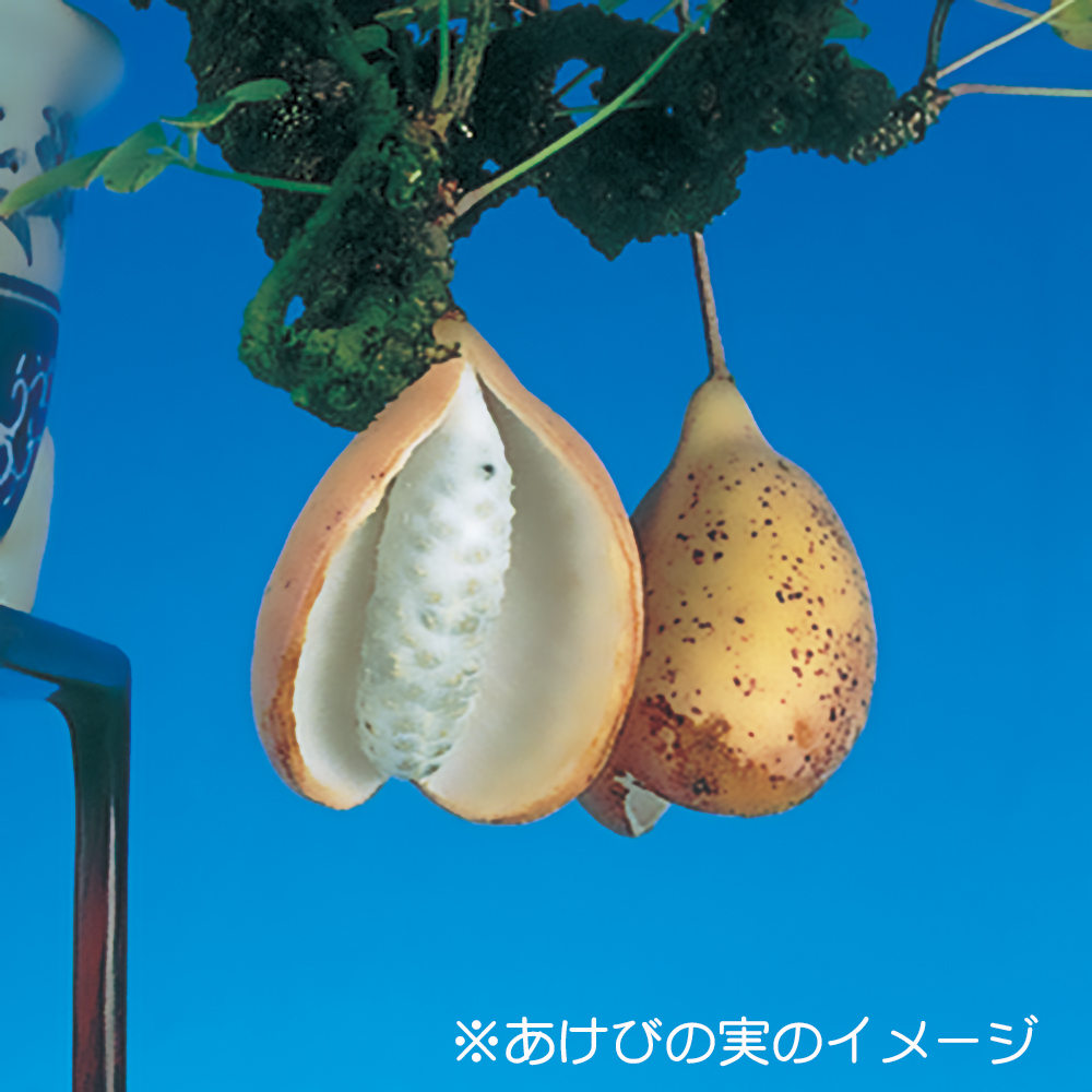 「アケビを持っているが、いっこうに実がならない」という声をしばしば耳にします。雌雄異花同株なので容易に結実しそうですが、アケビは1本では決して結実しません。近縁種でもかまわないので必ず2鉢以上用意して下さい。実が止まってからは、肥培管理が大切です。三要素のよい置き肥を秋まで切らさず与え、実の肥大に努めましょう。