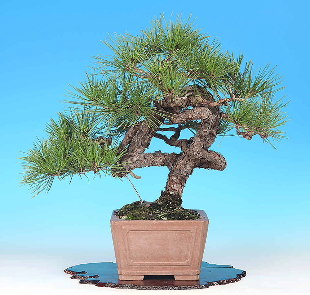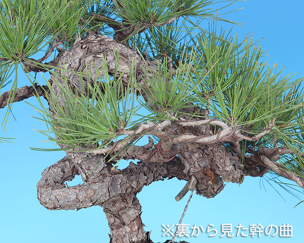 大きくループする幹模様が個性的な赤松。これだけの動きを見せる樹ながらコンパクトに収められている所も魅力です。幹に見る古色感も素晴らしく、赤松らしい自然味に富んだ一樹です。現状は幹模様に添わせて枝を置いて模様木樹形にまとめられていいますが、動きのある文人風に仕立てるのも面白い。樹形構想次第ではさらなる樹格向上も期待できる逸品です。