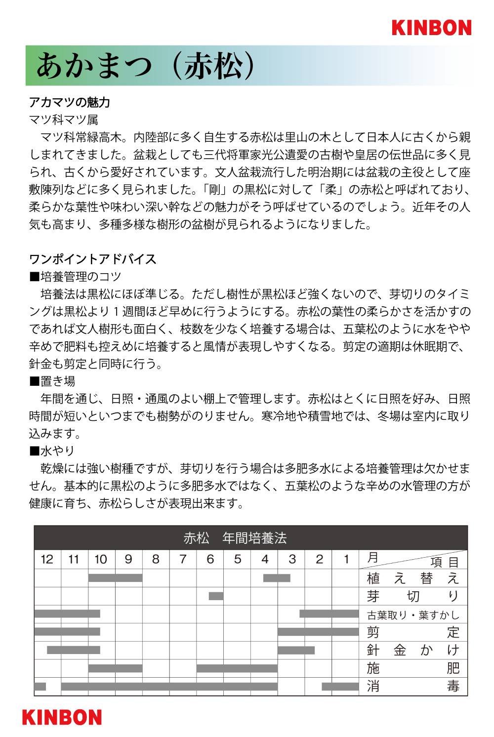 年間を通じ、日照・通風のよい棚上で管理します。赤松はとくに日照を好み、日照時間が短いといつまでも樹勢がのりません。寒冷地や積雪地では、冬場は室内に取り込みます。