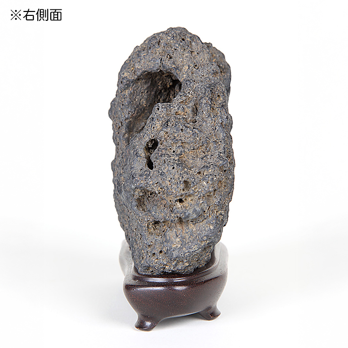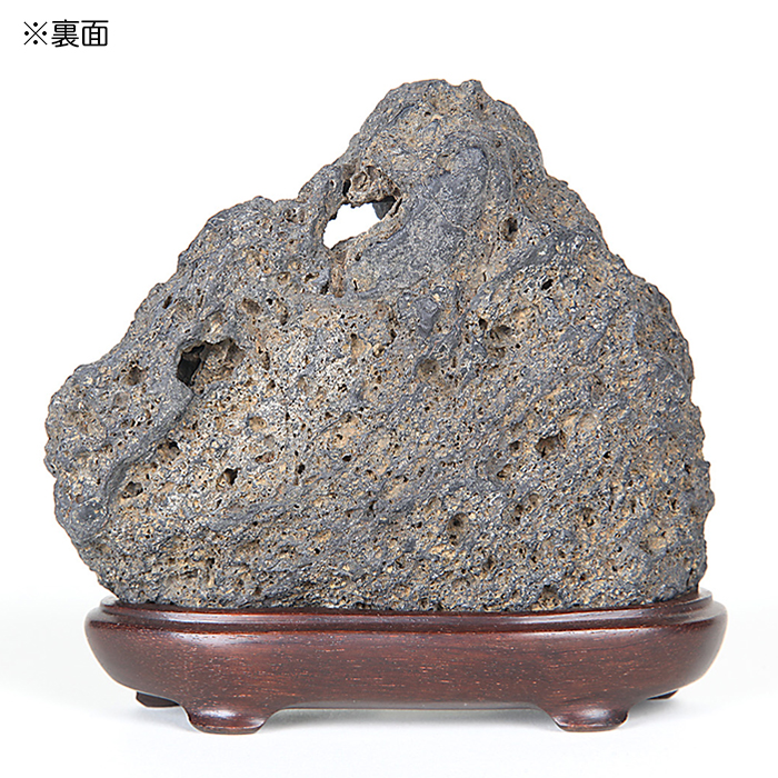 巣立ち状に不規則な凹凸が表れた石肌が味わい深く、また上部に見られる「抜け」が山岳の厳しい景色を感じさせる。落ち着いた色合いを見せる石質は、持ち込みの古さを証明している。