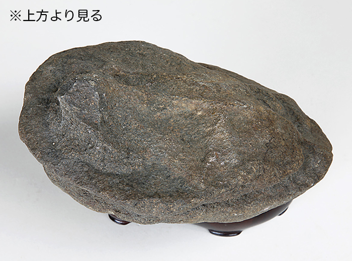 鞍馬石独特の、茶褐色をした滑らかな石肌が美しい。上面が遠山を望む石舞台を連想させる形状で、大きな景色が感じられる一石である。
