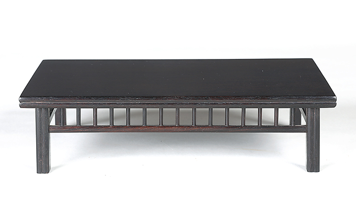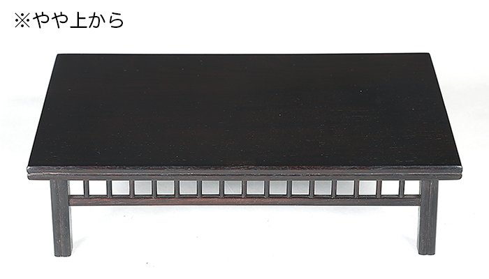 高級材である紫檀を使った贅沢な長方小卓。小品七点飾りのハネ出しや、三点飾りの主木などに重宝する寸法と風格が魅力。天板などに軽微な使用傷あり。