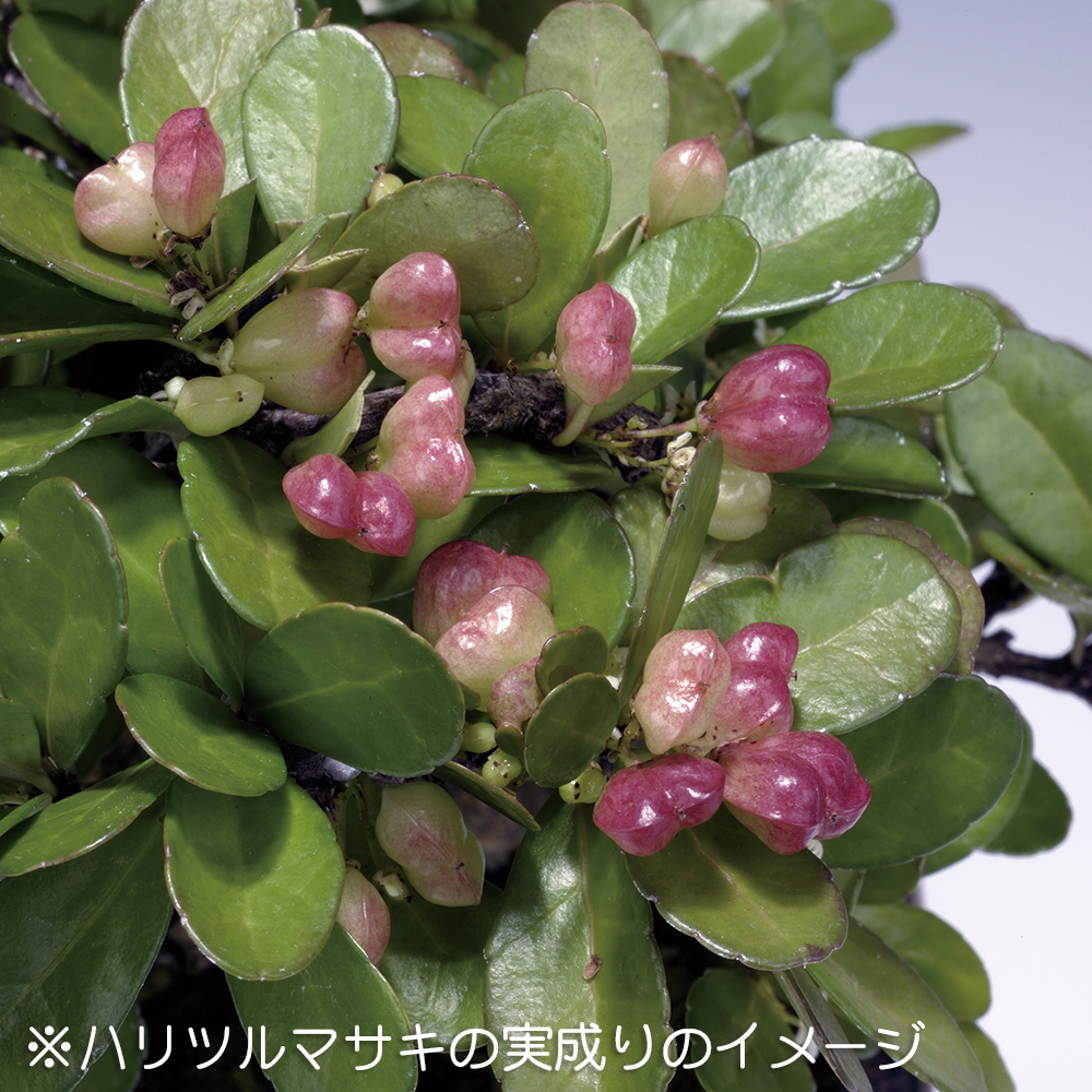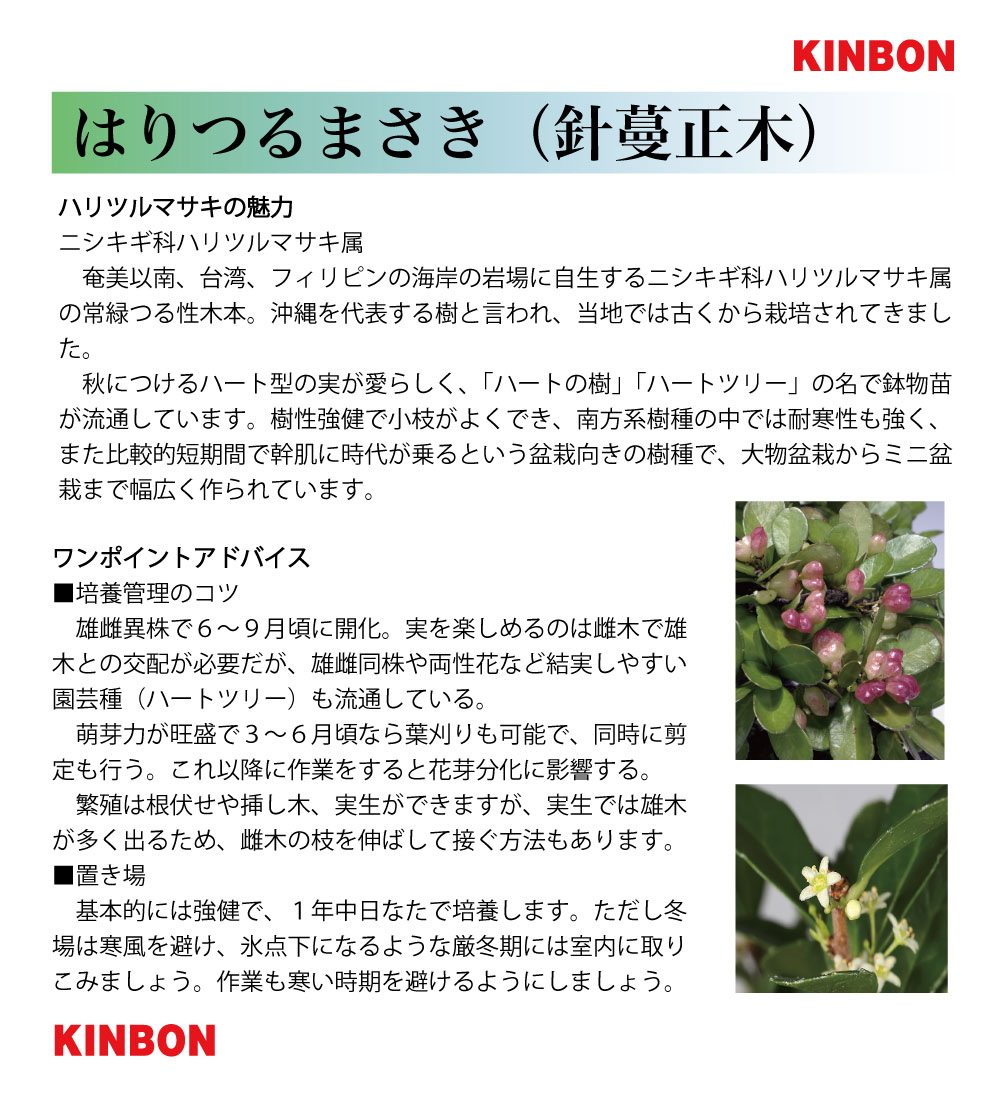 中国南部や台湾など温暖な地域の海岸の岩場に自生する常緑樹。南方系樹種の中では耐寒性があり、秋に色づく実がハート型で「ハートツリー」の名で園芸品が流通している。盆栽としての基礎づくりが済まされた根上がり素材を特選頒布!