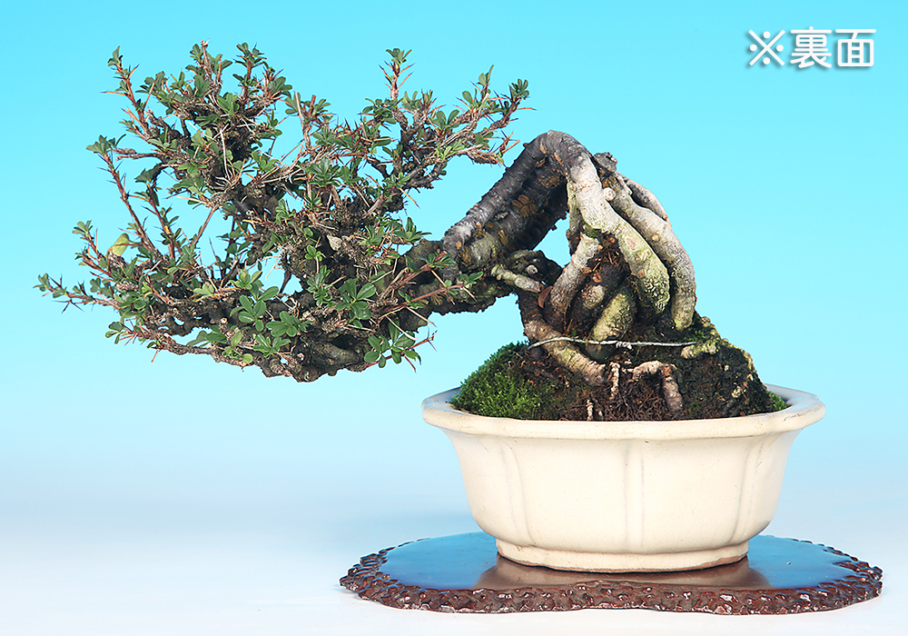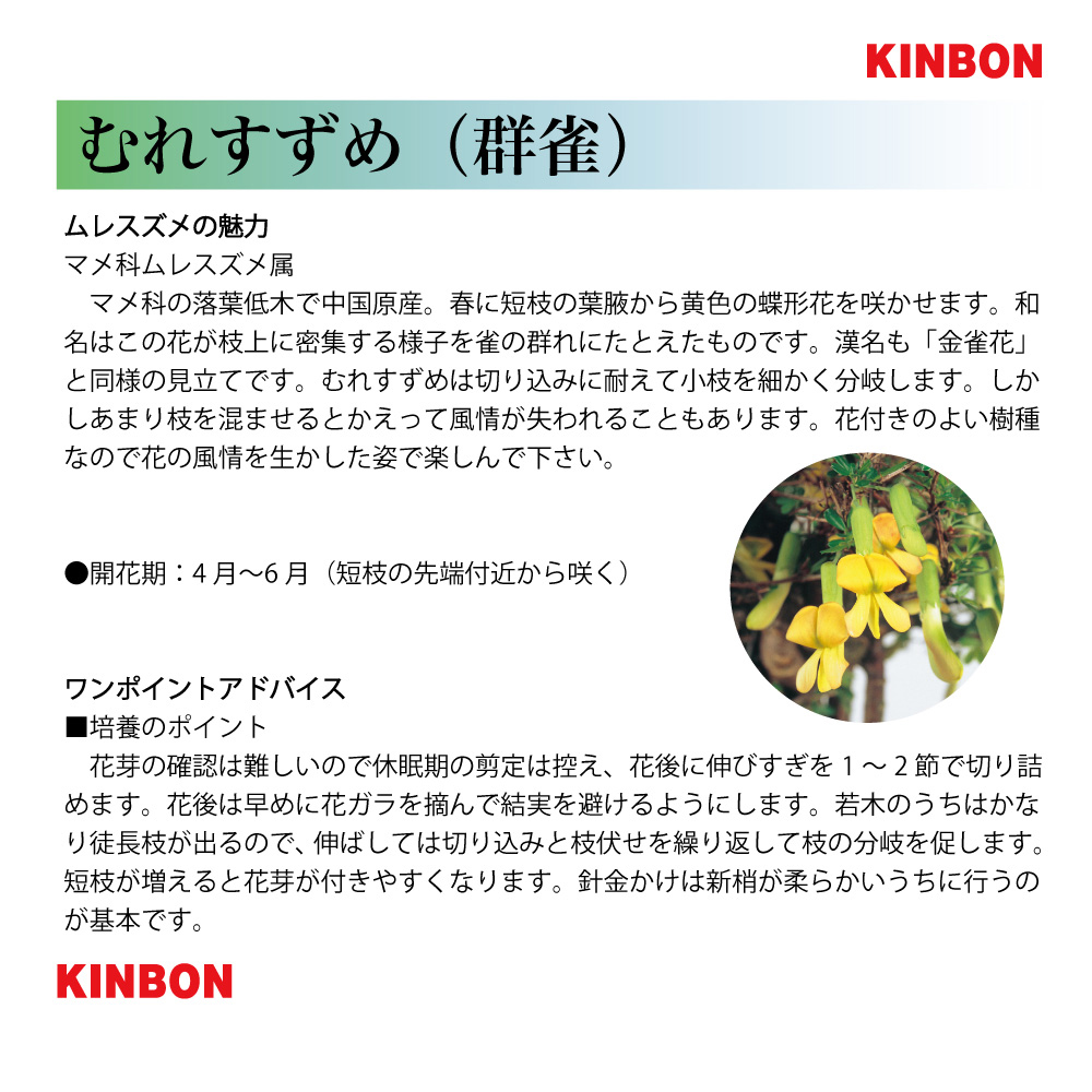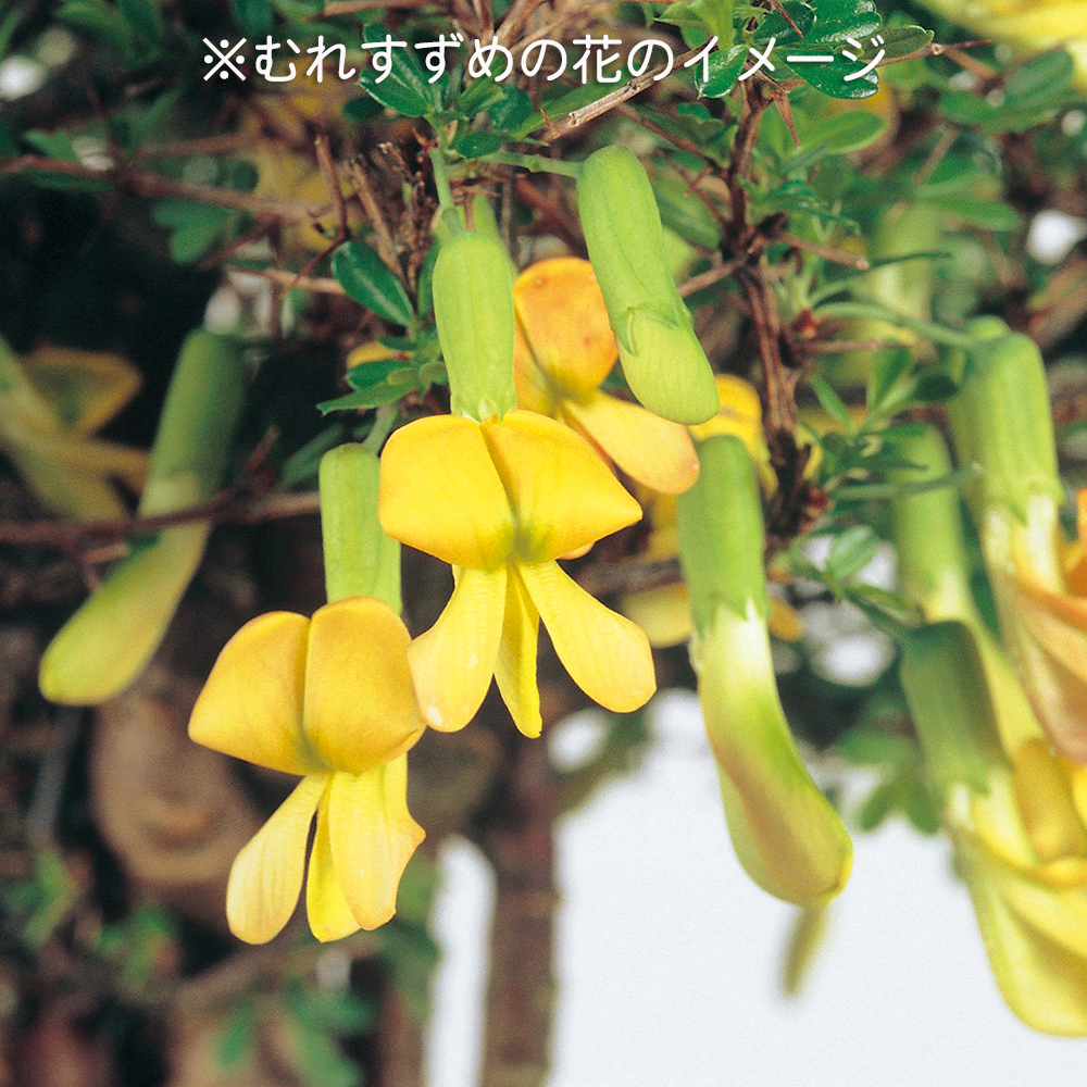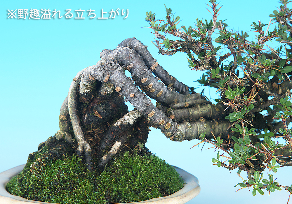 春先に蝶形の色鮮やかな黄花を咲かせる樹種。下向きに咲く小さな花は密生して付くことも多く、春の展示会などで人気がある。幹の大半が根で構成された素材で、独特の模様が入った幹肌が醸し出す古木の風情も格別。
