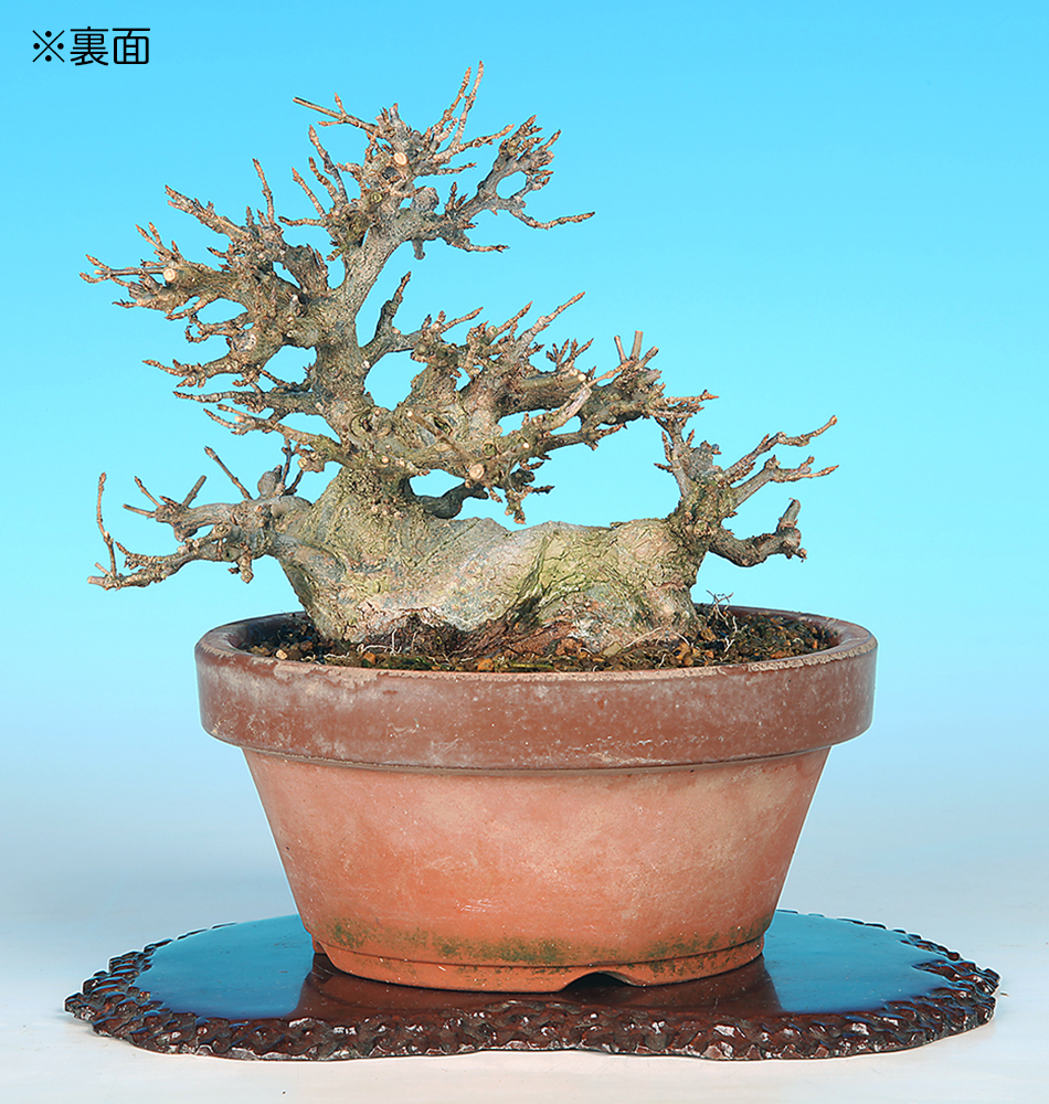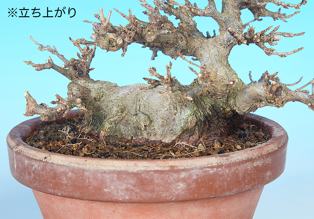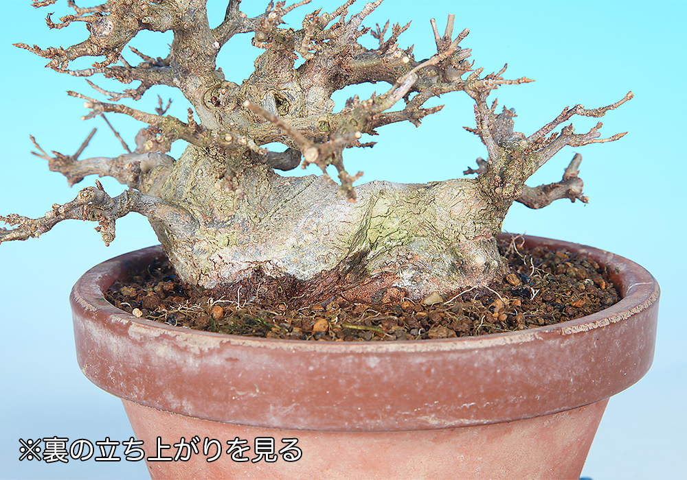 太幹が横たわったような立ち上がりの迫力に注目。足元の両端から主幹と子幹が伸びだすという特異な樹形も面白く、この幹模様をうまく活かした個性的な樹姿に仕上げたい。