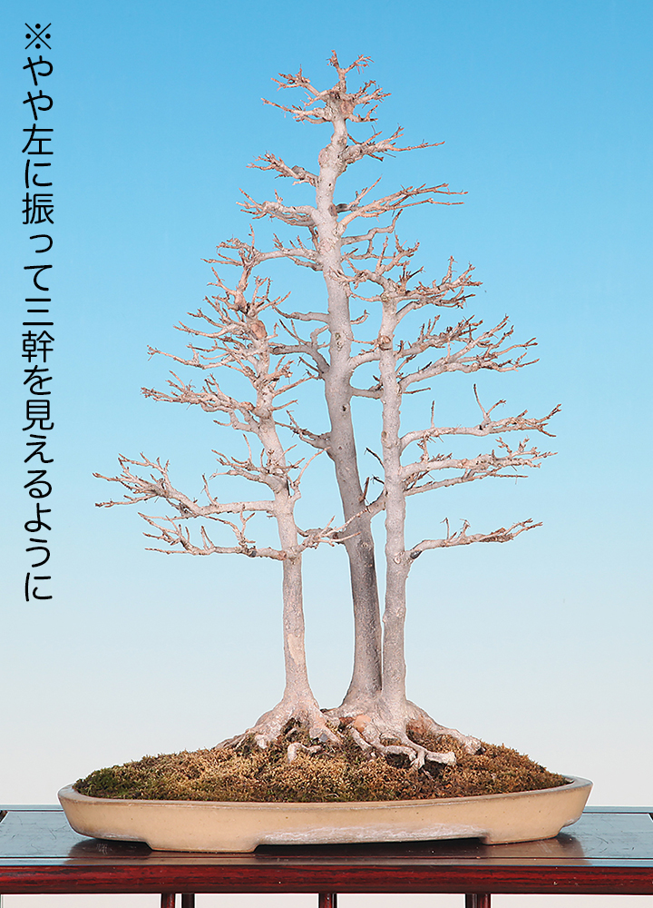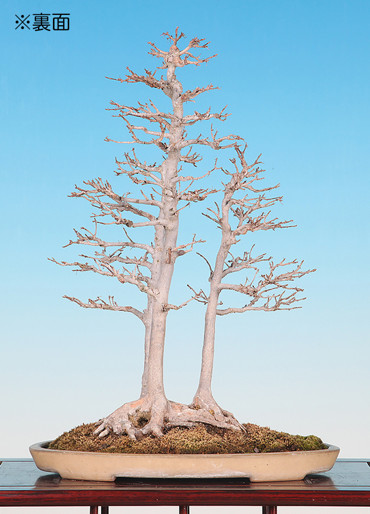 細い直幹素材を寄せて株立風の姿にまとめられたものだろうか。足元の根張りでしっかりと癒着しており、持ち込みの古さがよく分かる。正面変更で幹の重なりを回避することで、細幹樹ならではの素朴な味わいを引き出すことができる。飾ってこそ真価を発揮する逸品。