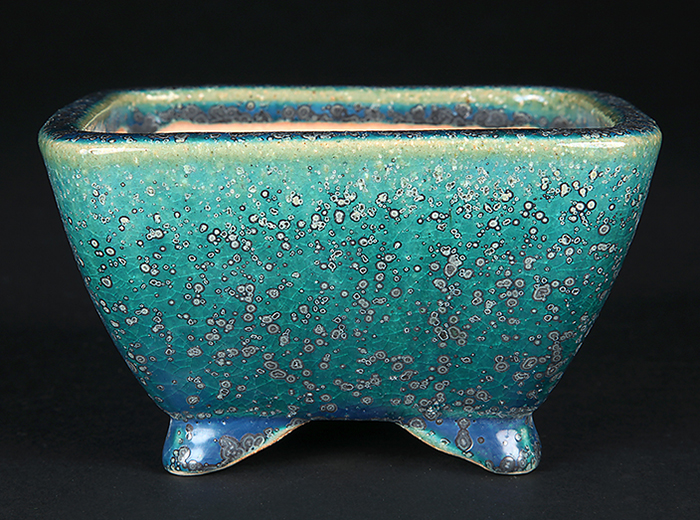 足元が狭まった丸みのある正方型で、太幹の懸崖や吹き流しなど、流れのある樹形との相性が良い。箱付。落款あり。