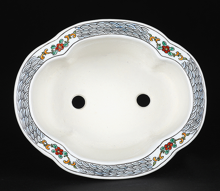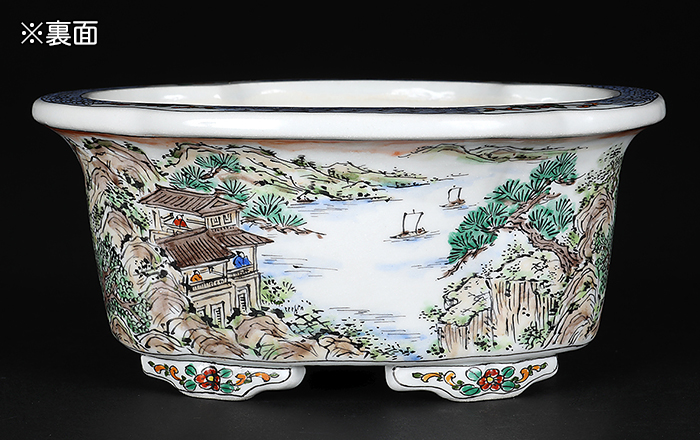 近年は小品盆栽に使える長方鉢、木瓜式鉢などを中心に作陶。また得意のロクロ成型からの削り出しによる六角型の輪花縁といったオリジナルデザインも生み出しています。絵付けは涌泉が用いた山水や雲龍図などをベースにしていますが、五彩などは技術の向上により正泉独自の色彩を表現、国内のみならず海外でも高い人気を誇ります。