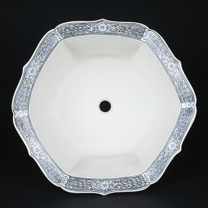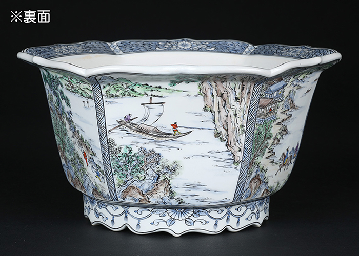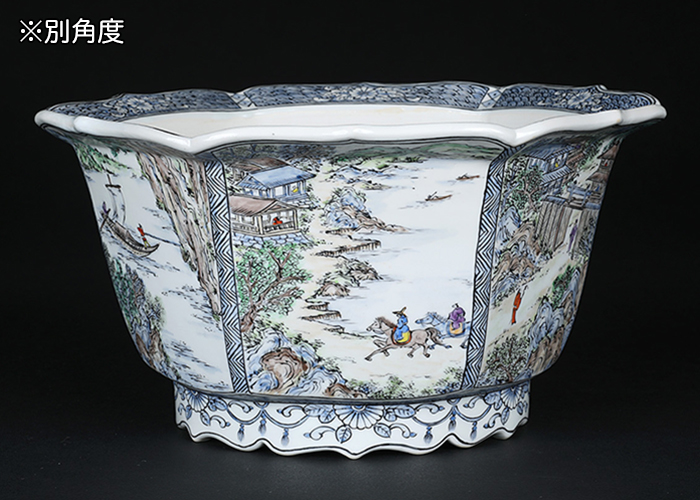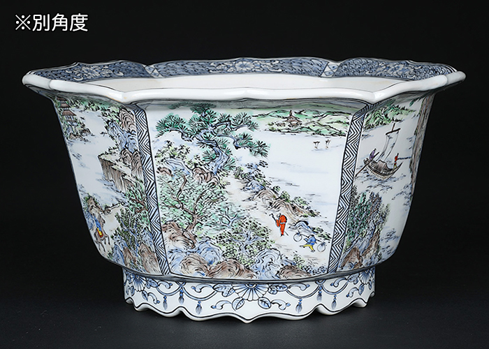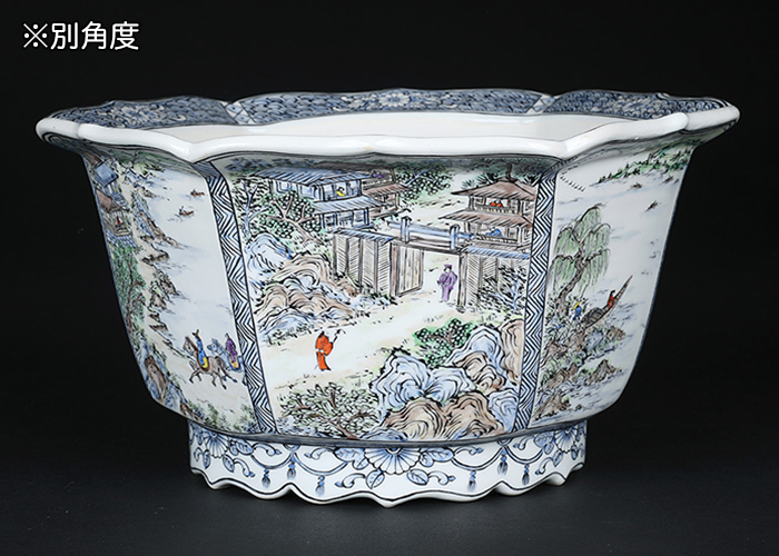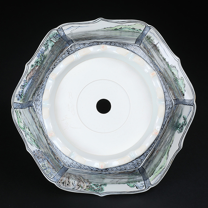 間口が20㎝以下の小鉢が中心の正泉には珍しい大きさで、小ぶりな中品に使える型・寸法である。六面全てに異なる山水の風景が描写されており、いずれの面も正面使いが可能。六角型ながら、縁は輪花式の型で成型されているのも面白い。落款:月之輪正泉