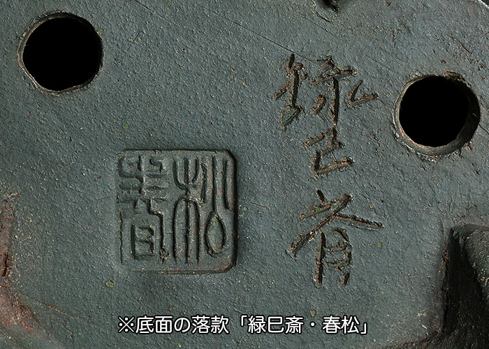 額面に白泥が施され、茶山が彫刻細工した作品。春松と茶山の合作は貴重で、風格漂う逸品。木箱付。落款:緑巳斎・春松・茶山彫