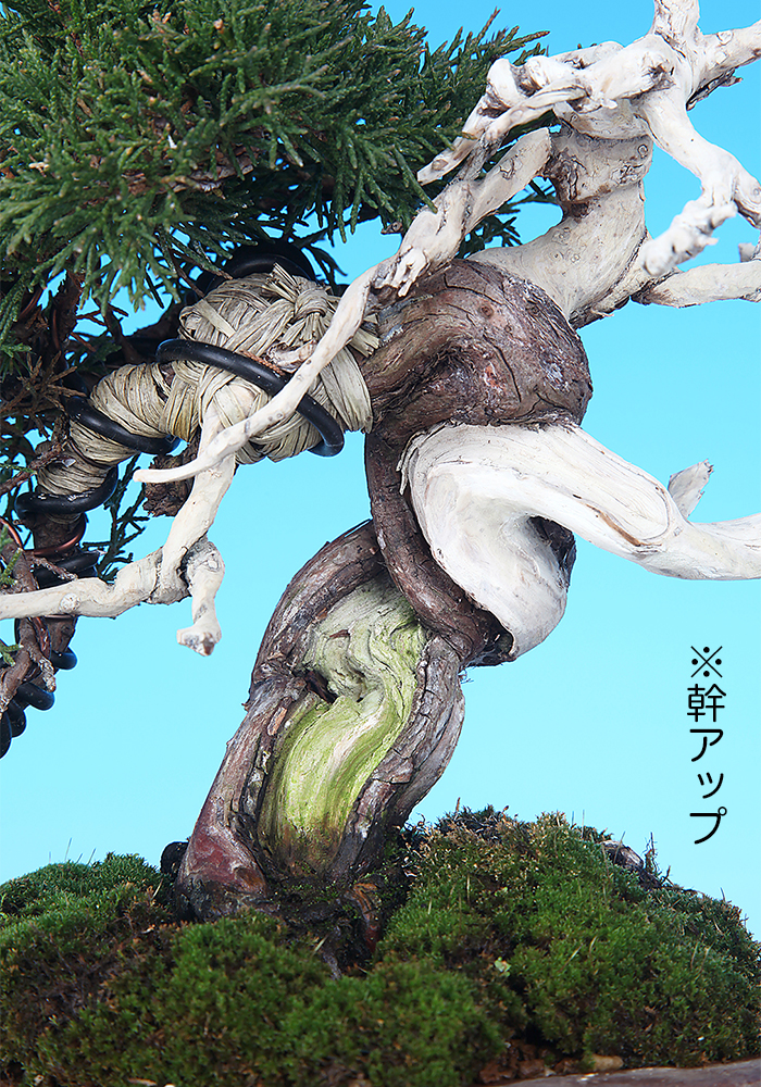 幹を曲げて模様木にまとめられた真柏。シャリや枝ジンの存在がよく利いており、数年の持ち込みで主木として使える姿に仕上がるだろう。