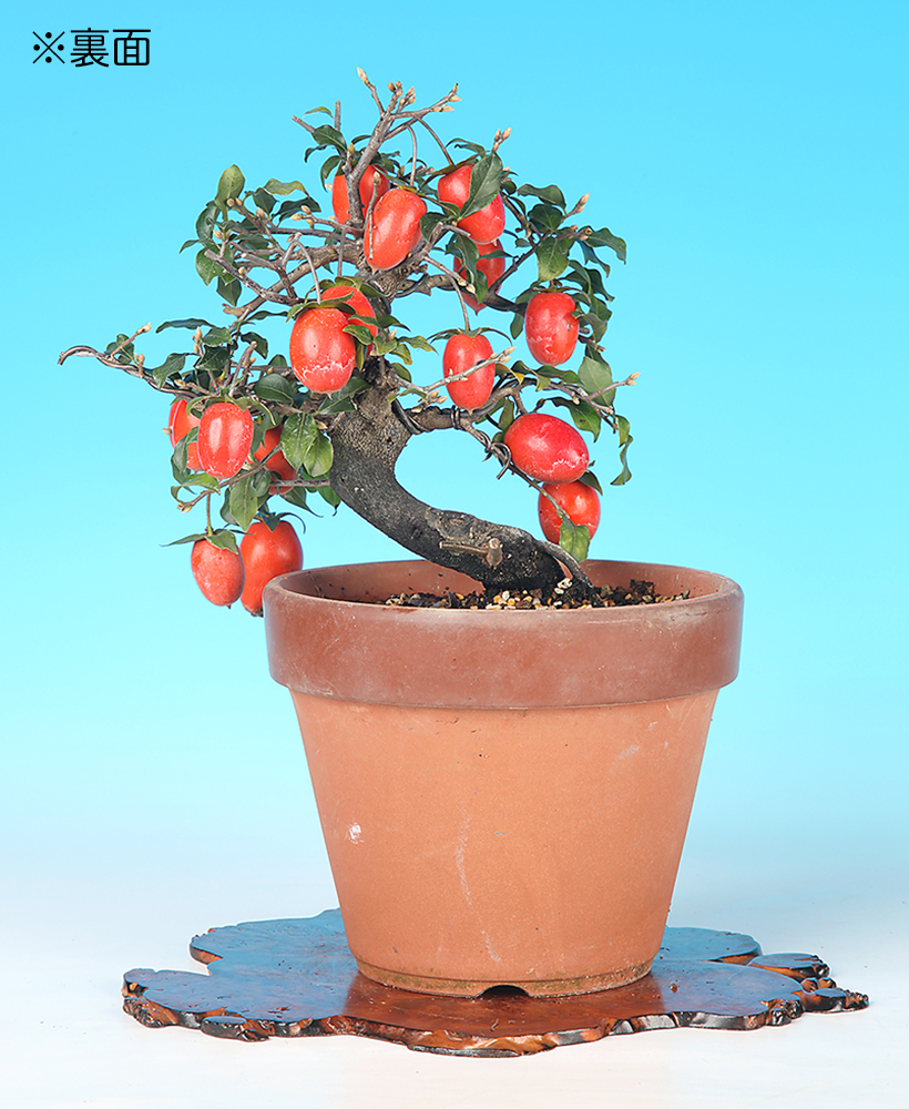 柿の常緑品種・常盤柿。老爺柿と違って、丸い小さな実が特徴です。小品栽に収まるサイズながら太さ十分の幹に秀逸な模様を有した優良素材。枝も混んでおり、完成度まであと少し。鉢替えをすれば、この秋には飾れます。