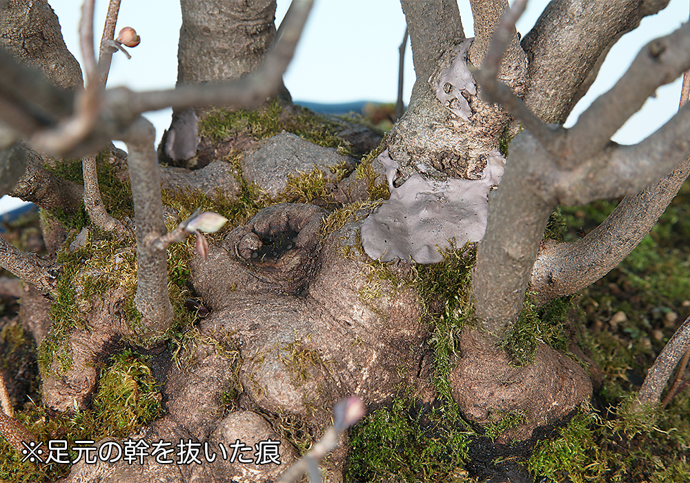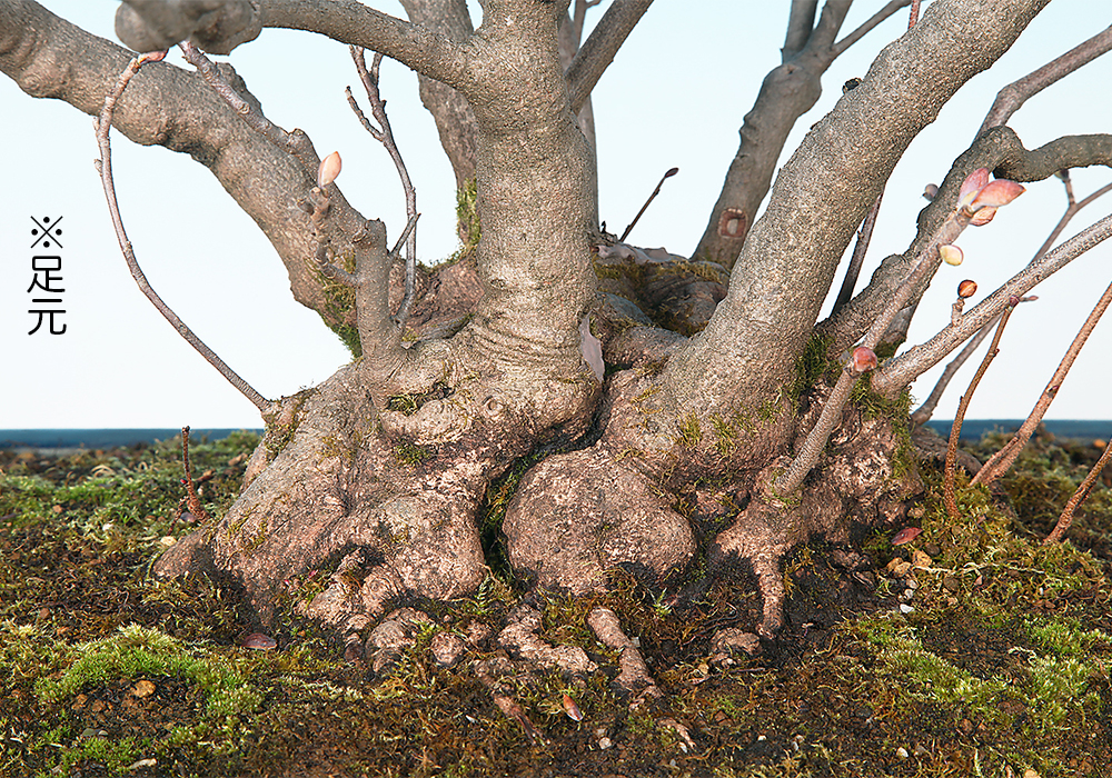 丸く膨らんだ立ち上がりから複数の幹が伸びだした甲羅吹き樹形の土佐水木。細かくほぐれた枝先が、雑木らしい優しさを感じさせる。足元で幹を切断した痕が残っているが灼けなどの心配はない。