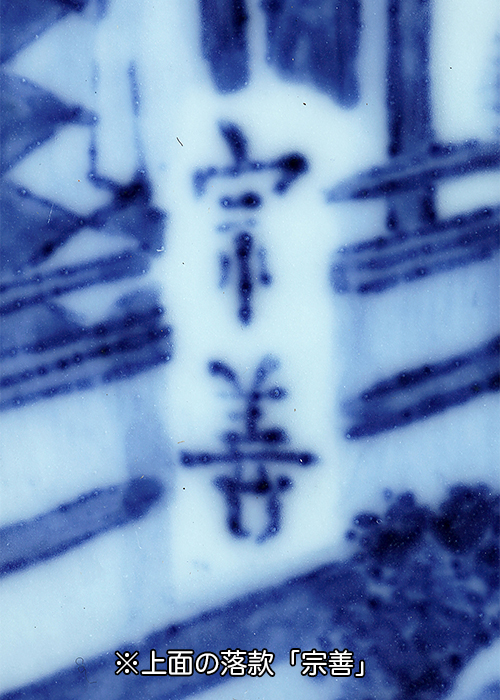 河のほとりで催された酒席と、舟でその集まりへと向かう人物の様子が描かれた大型の陶板。落款:宗善・宗善