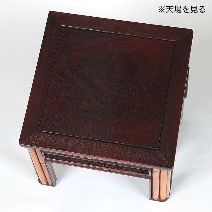 清涼感溢れる竹節細工が施され、夏飾りに最適の逸品。紫檀材を使った天板の木目も美しい。箱付。わずかなガタと竹節細工の欠損あり。
