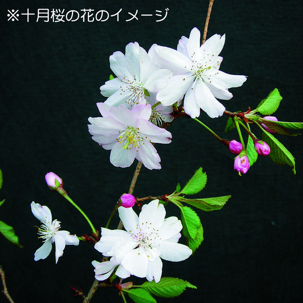 日本の春を代表する花木・桜。盆栽としても春の展示会には欠かせない存在です。「十月桜」は彼岸桜の園芸品種と言われ、白の八重花を清楚に咲かせる人気品種。10月頃から断続的に咲き、春にも咲く二季咲きです。また枝打ちが細かくできることから小品盆栽・ミニ盆栽向きの品種です。