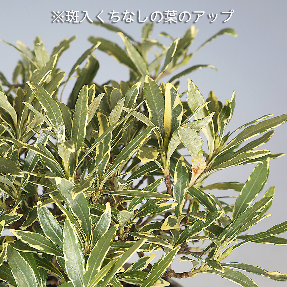 芳香のある純白の花と特異な実の姿で人気のくちなし。常緑種で冬場に実を楽しめることでも盆栽樹種として人気が高いです。そのくちなしの斑入品種。春の花姿、秋〜冬の実姿に加え葉芸が楽しめる一年中見応えのある素材です。