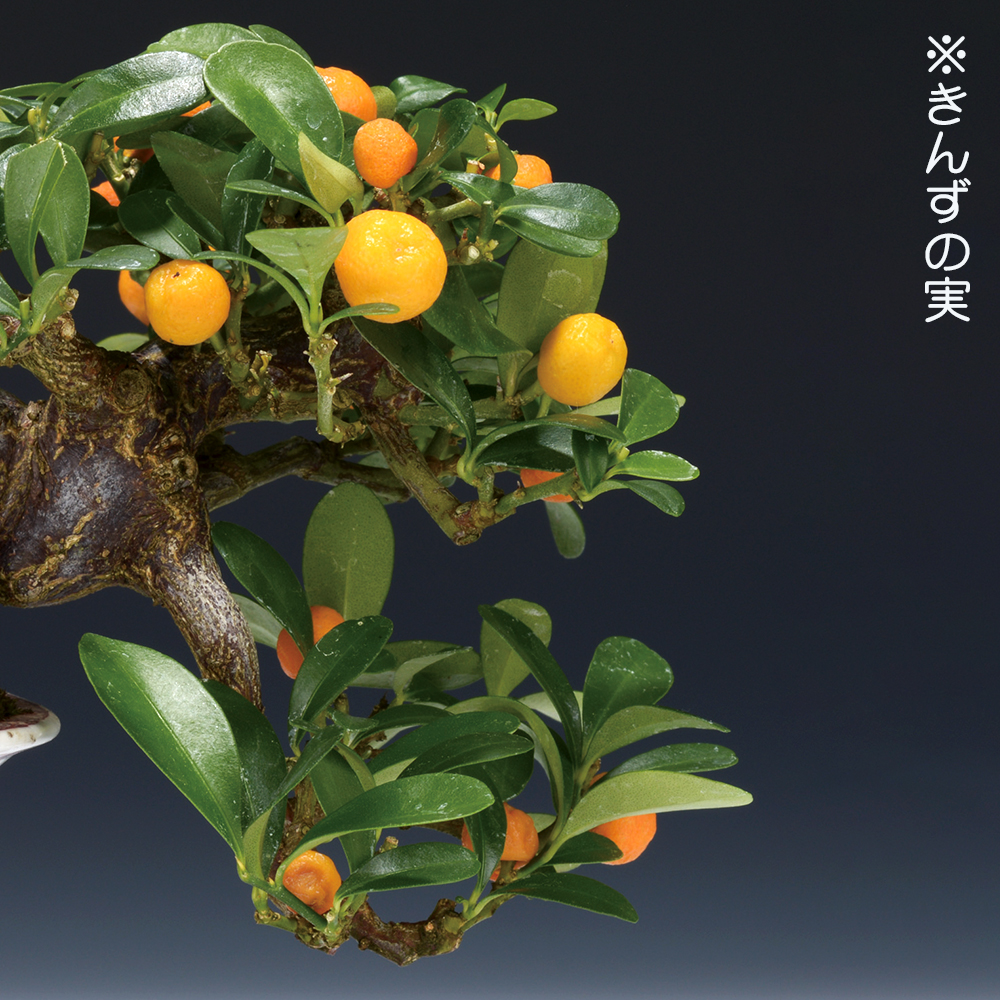 小型ミカンの一種で、地植えでも1mに満たない小型の樹木「きんず」。枝打ちの粗い柑橘類の中では際立って枝打ちが細かく、芽吹きも旺盛で枝づくりのしやすさもあり、盆栽樹種とした極めて高い人気を誇ります。そして何よりの魅力は実姿です。赤黄色に熟す径1cmほどの小さな果実は、彩りの少ない冬場に存在感たっぷり。花が咲けば、ほぼ実が成り、実も長く持つので、初心者も十分に楽しめる樹種です。