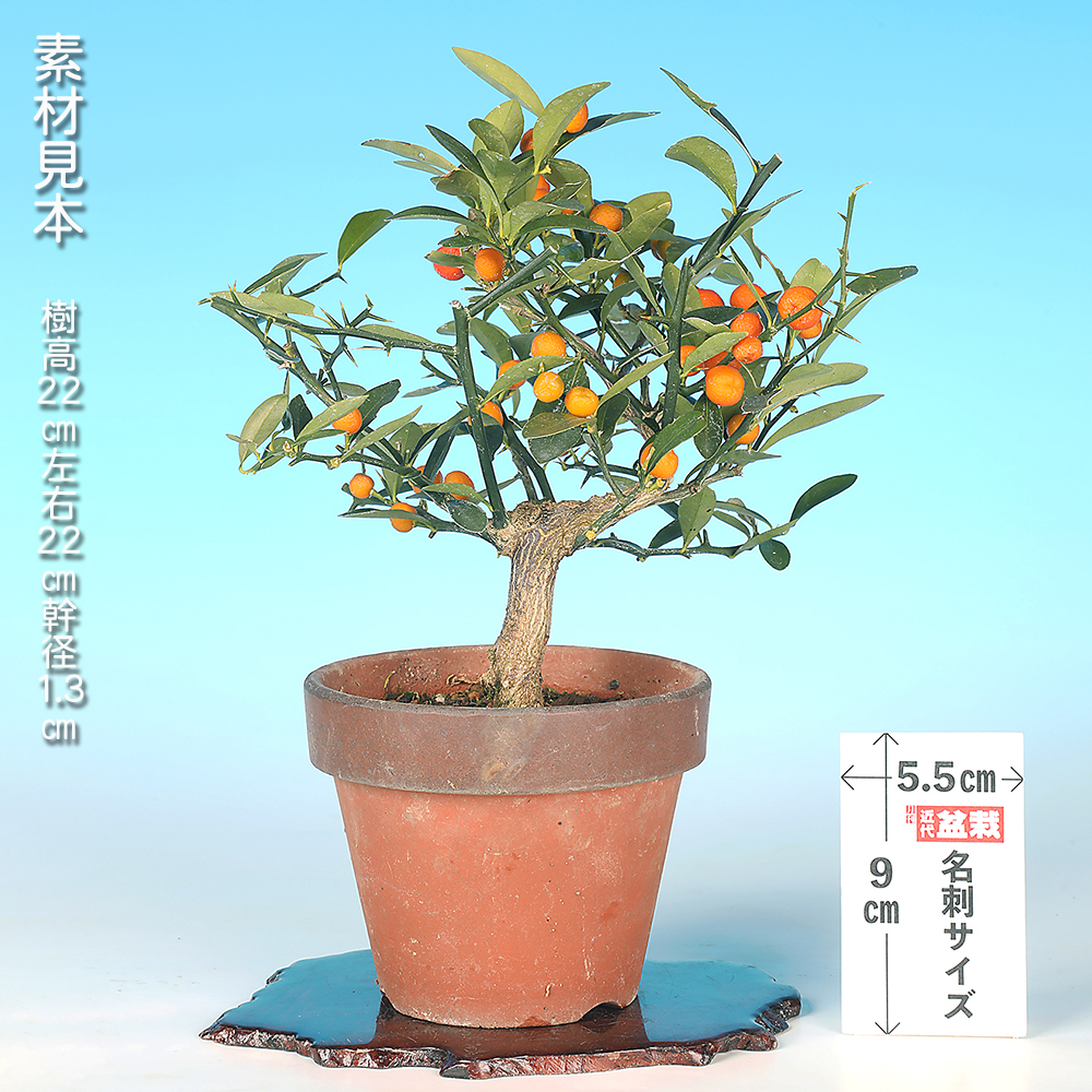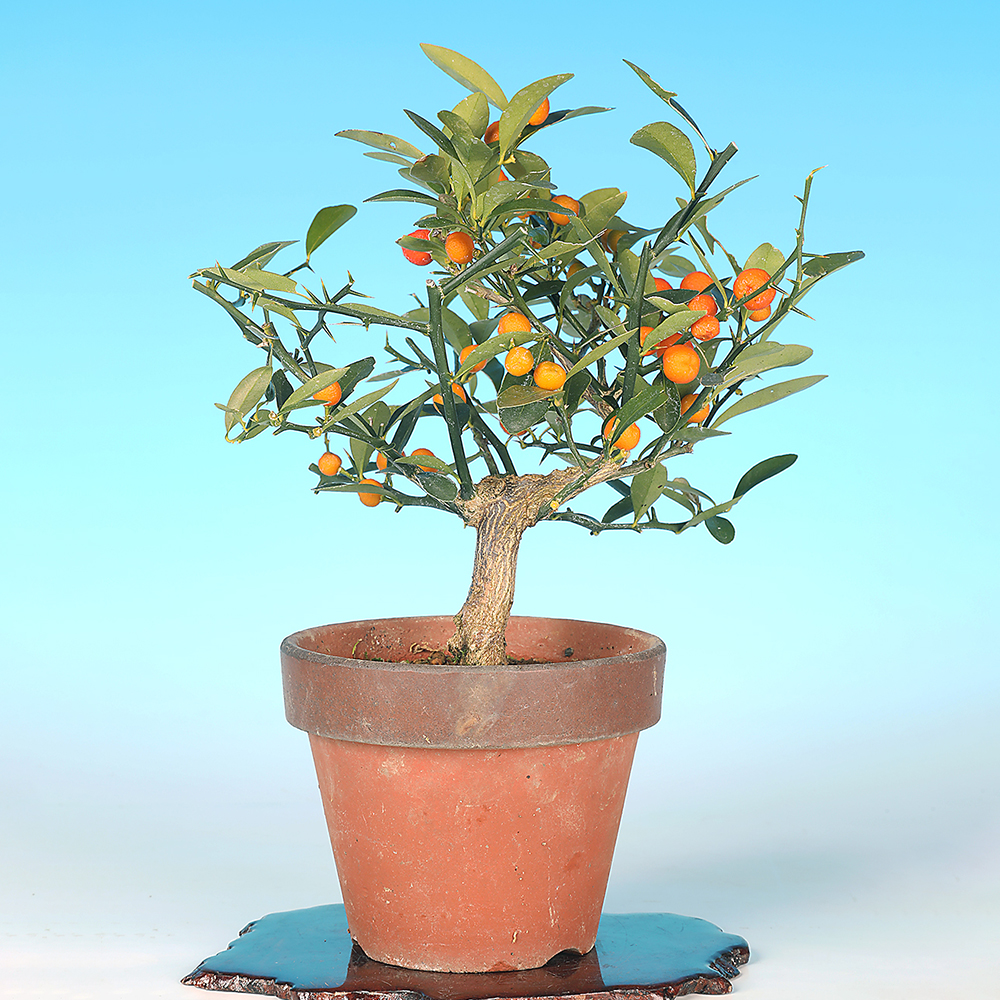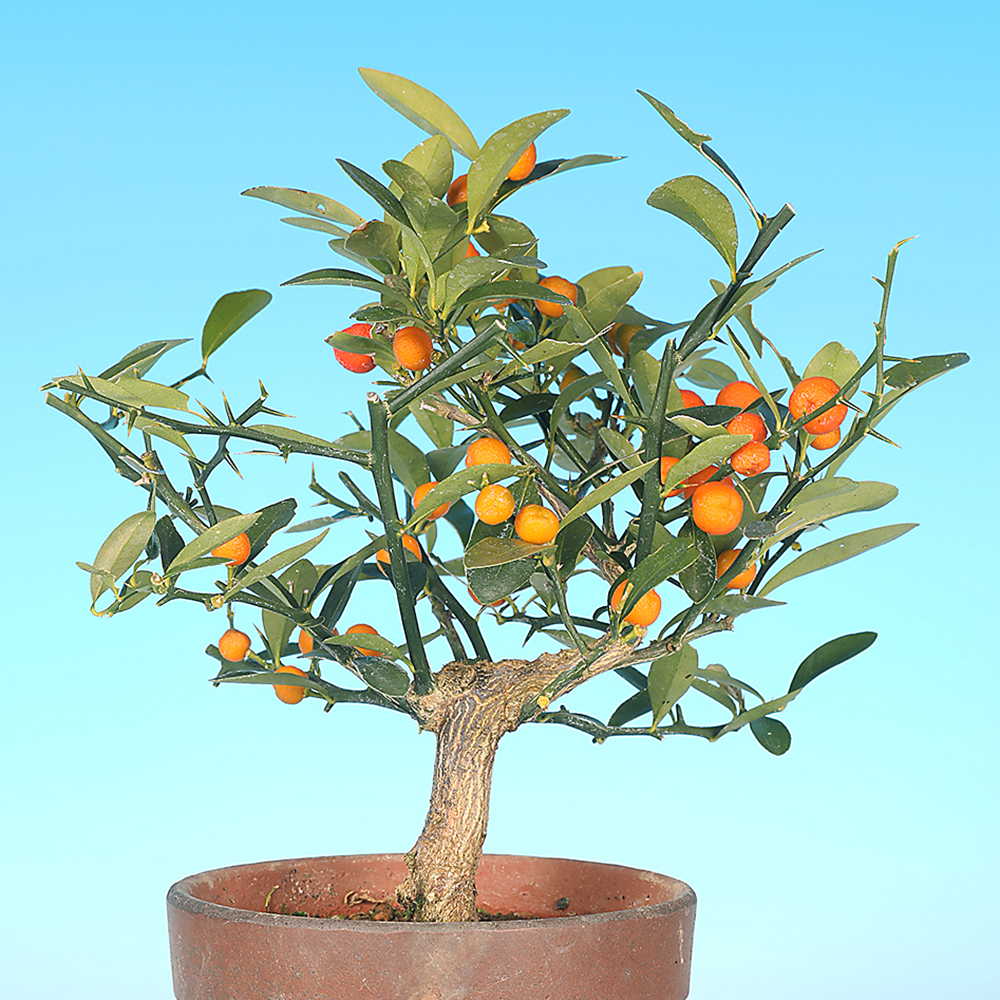 マメキンカン(豆金柑)の和名を持つ中国原産樹で、小型ミカンの一種。もともと地植えでも1メートルに満たない小型の樹木です。枝打ちの粗い柑橘類の中では際立って枝打ちが細かく、芽吹きも旺盛で枝づくりのしやすさもあり、鉢での鑑賞・盆栽適性に富んだ樹種だと言えます。
